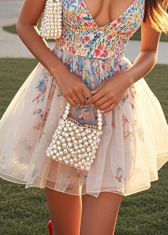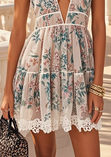 Elegant Apricot Deep-V Neck Print Chiffon Mini Dress Summer
