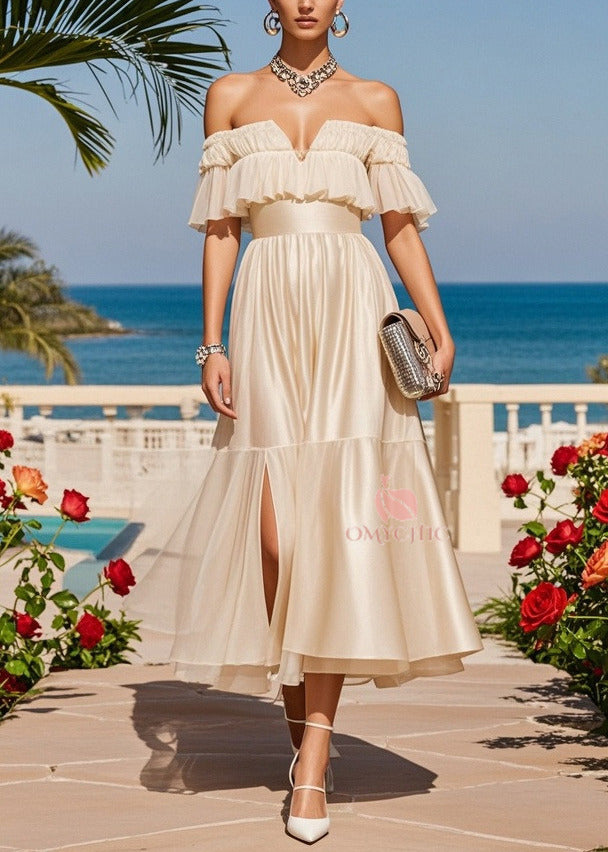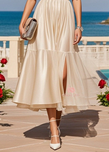 Fitted Apricot Cold Shoulder Side Open Silk Strapless Dresses Summer