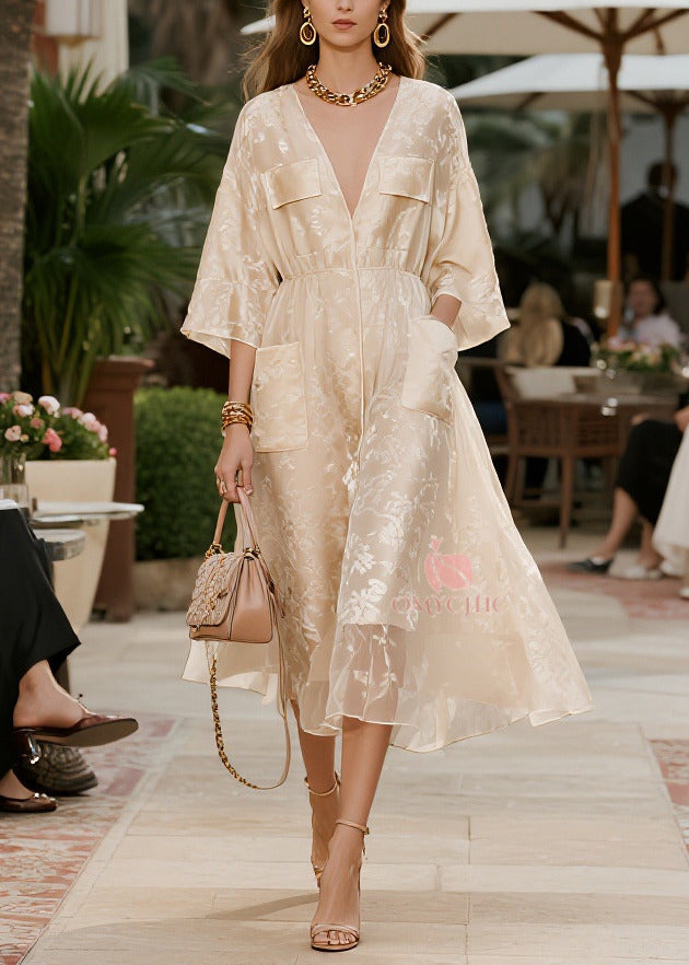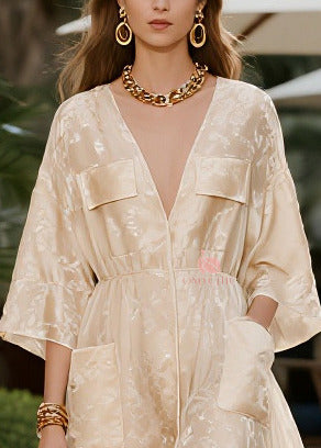 Loose V Neck Pockets Patchwork Silk Long Dress Summer