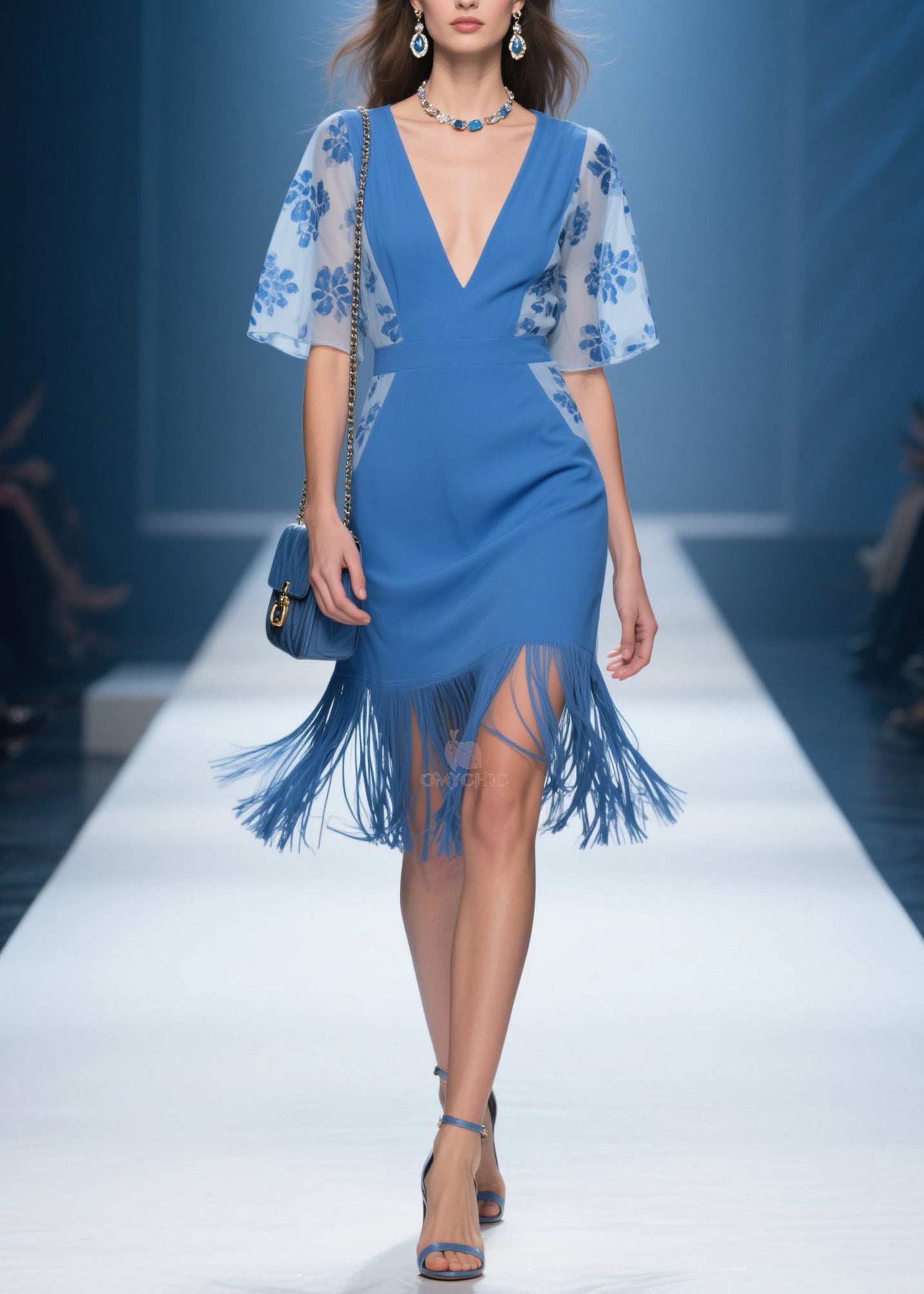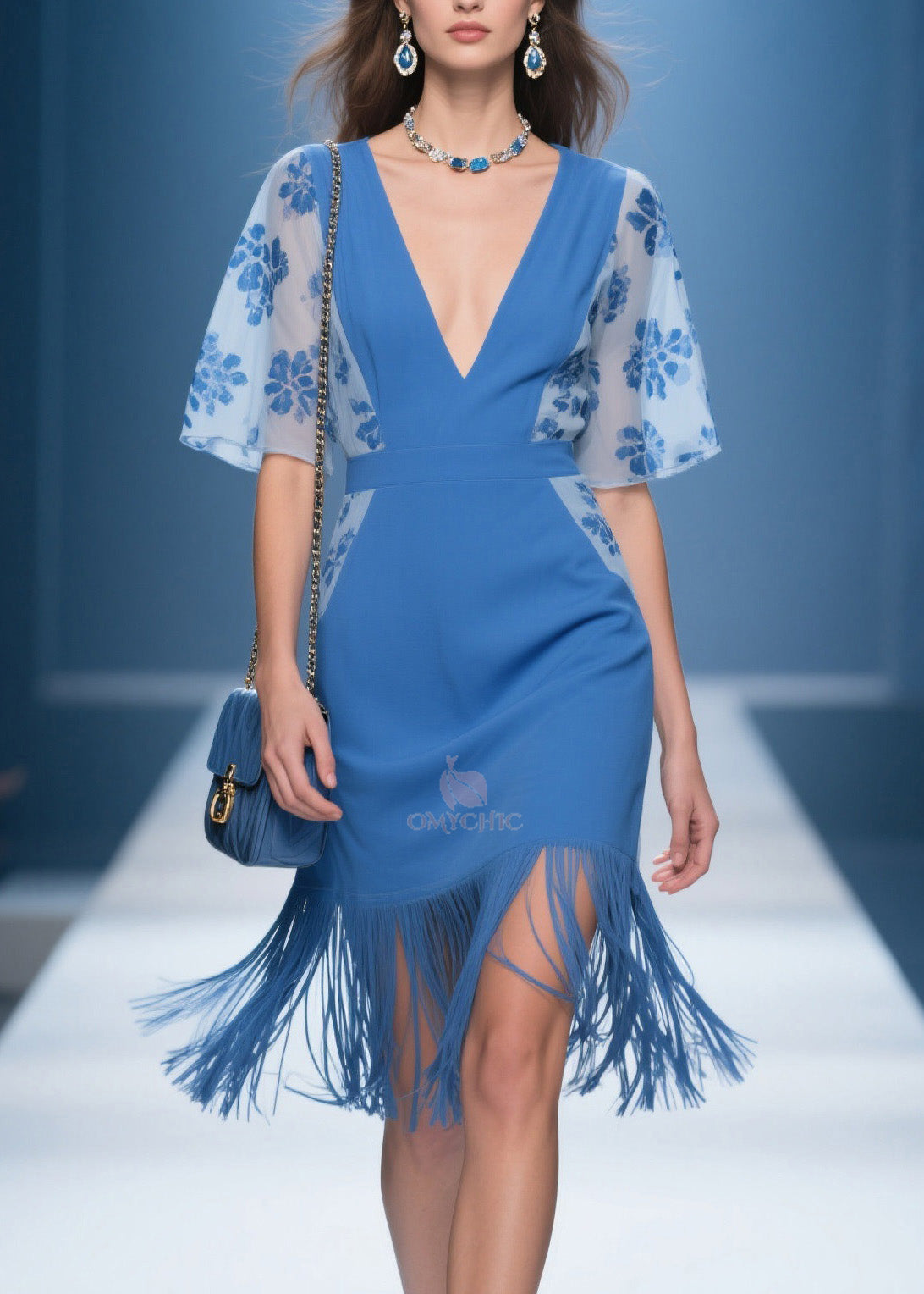 Handmade Blue V Neck Print Tassel Patchwork Cotton Dresses Summer