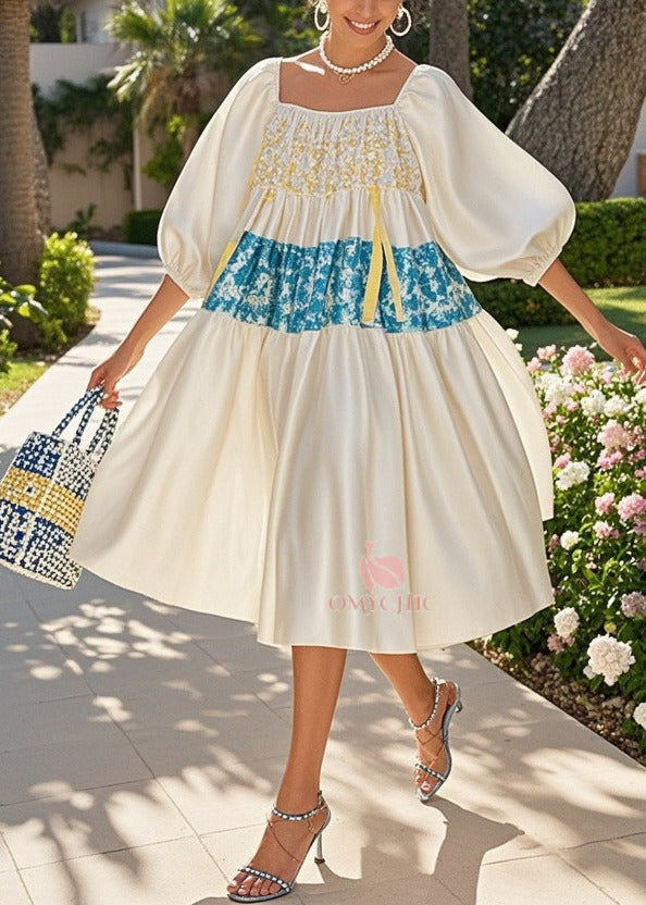 Stylish White Oversized Patchwork Satin Holiday Dress Puff Sleeve