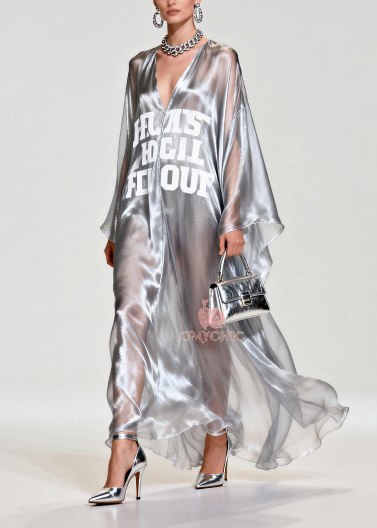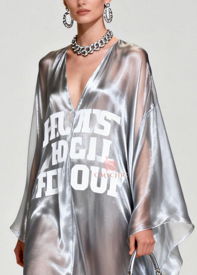 Women Silvery Letter Print Exra Large Hem Chiffon Beach Dresses Summer