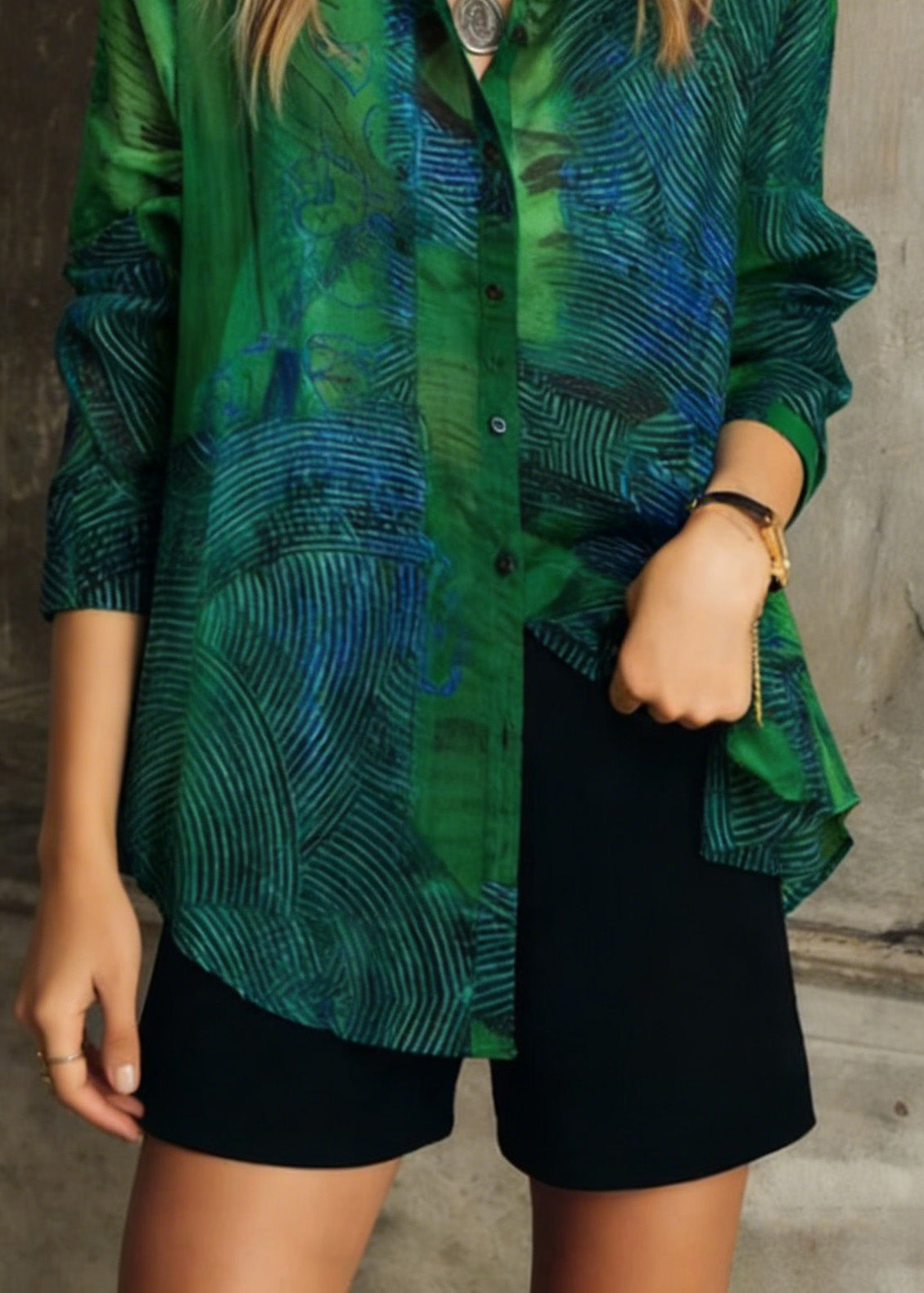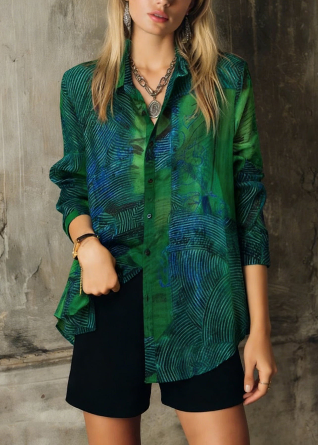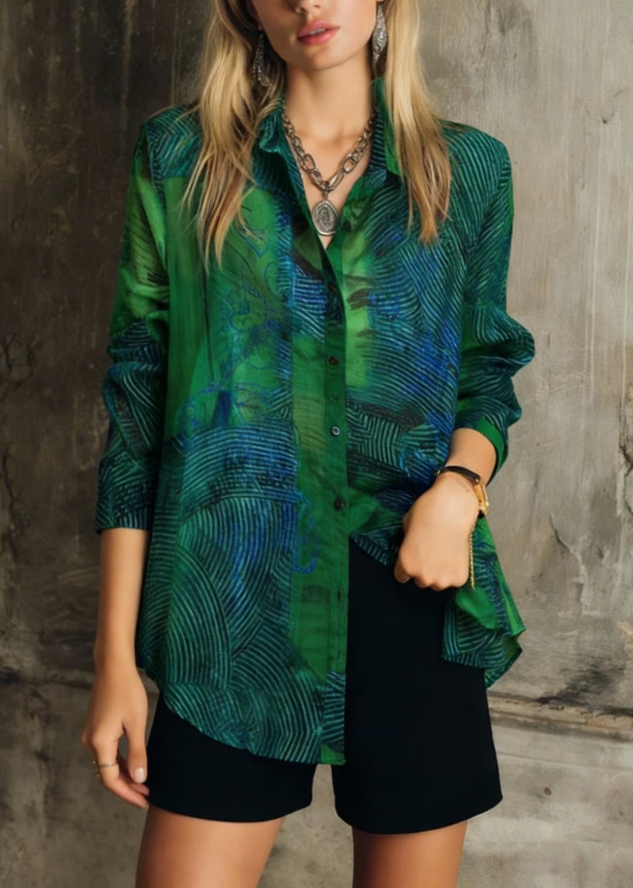 Fashion Green Peter Pan Collar Print Patchwork Cotton Shirts Long Sleeve
