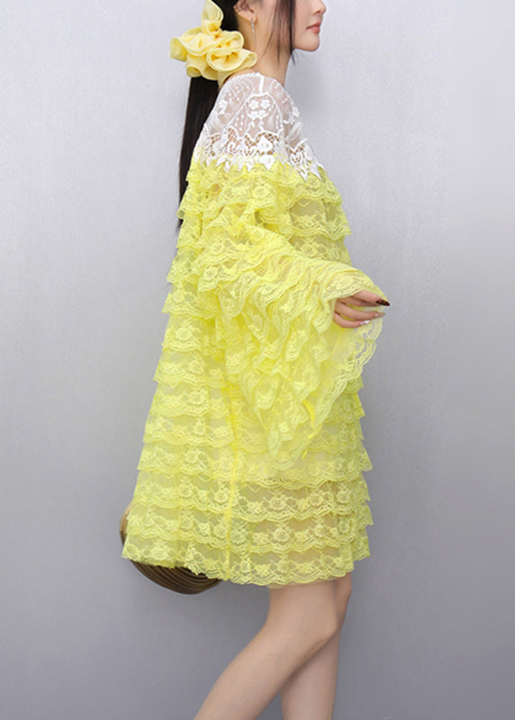 Original Design Yellow O-Neck Sheer Knit Lace Tops Fall