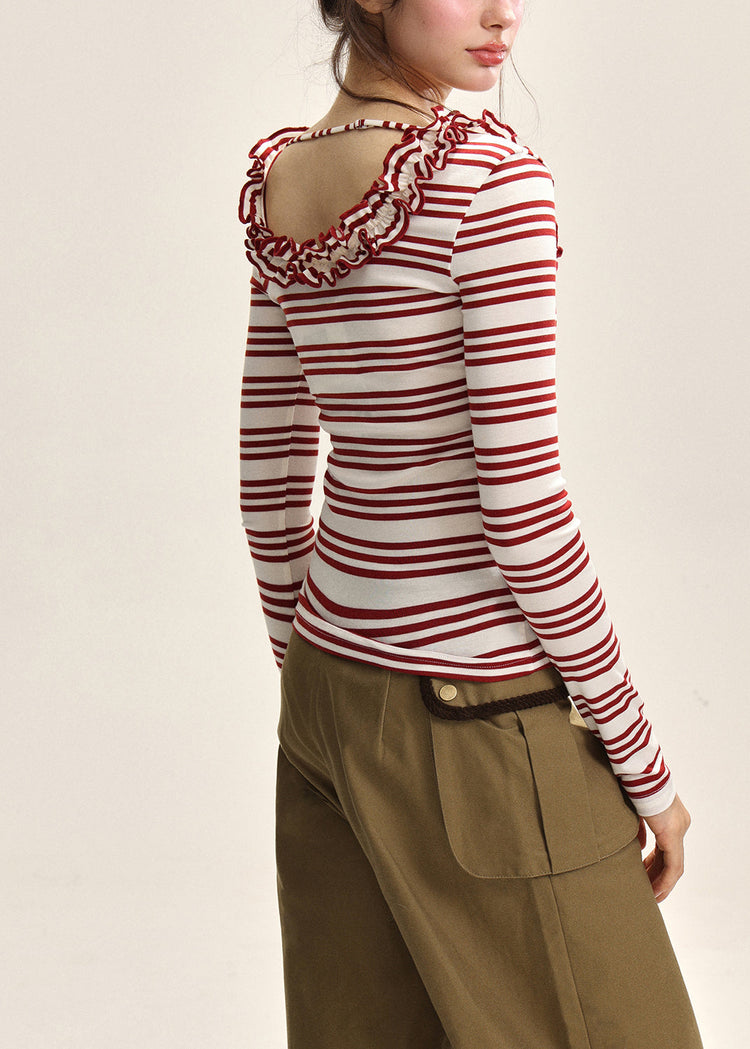 Slim Fit Red White Striped U Neck Top Fall