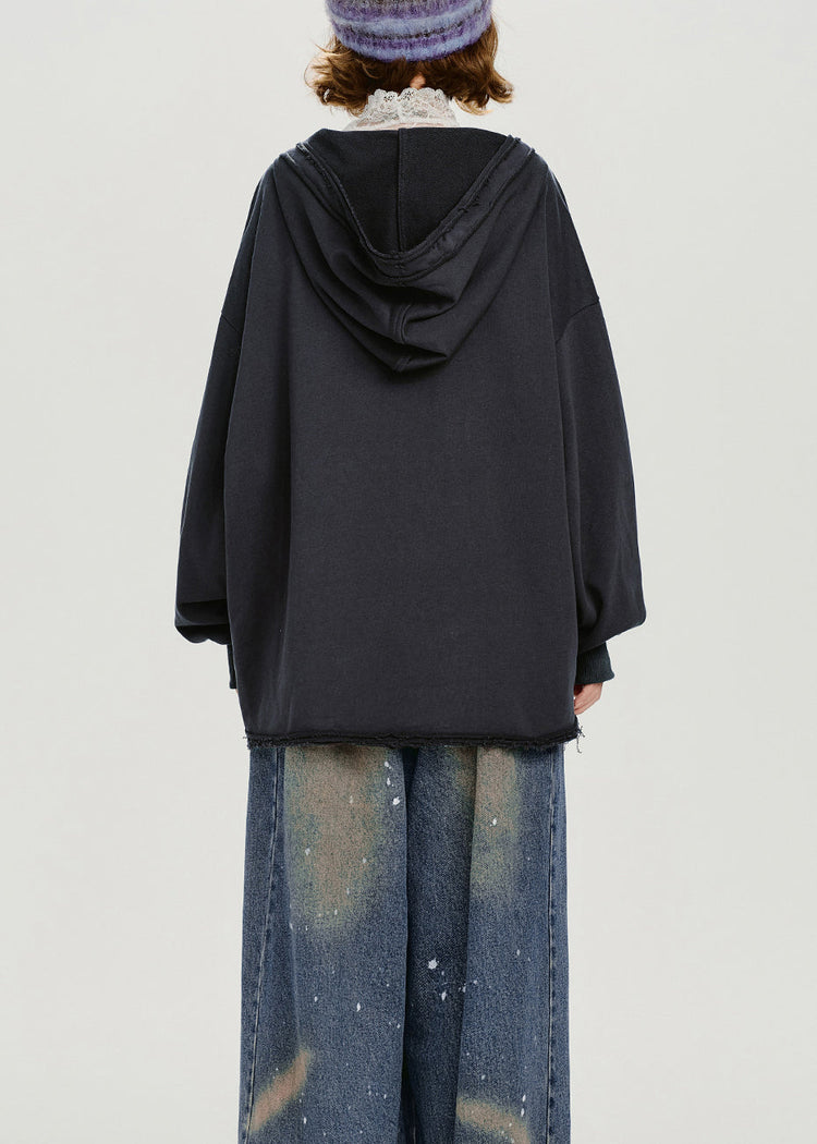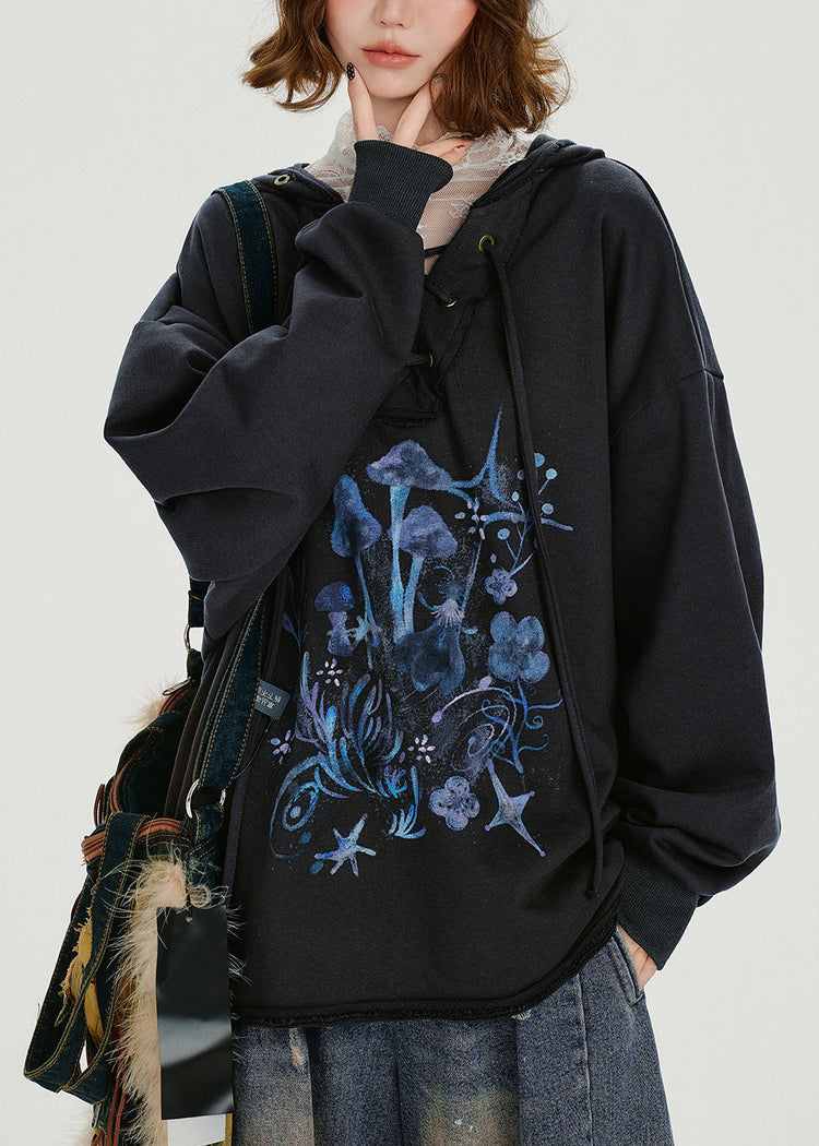 Women Dark Grey Hooded Print Cotton Pullover Sweatshirt Spring