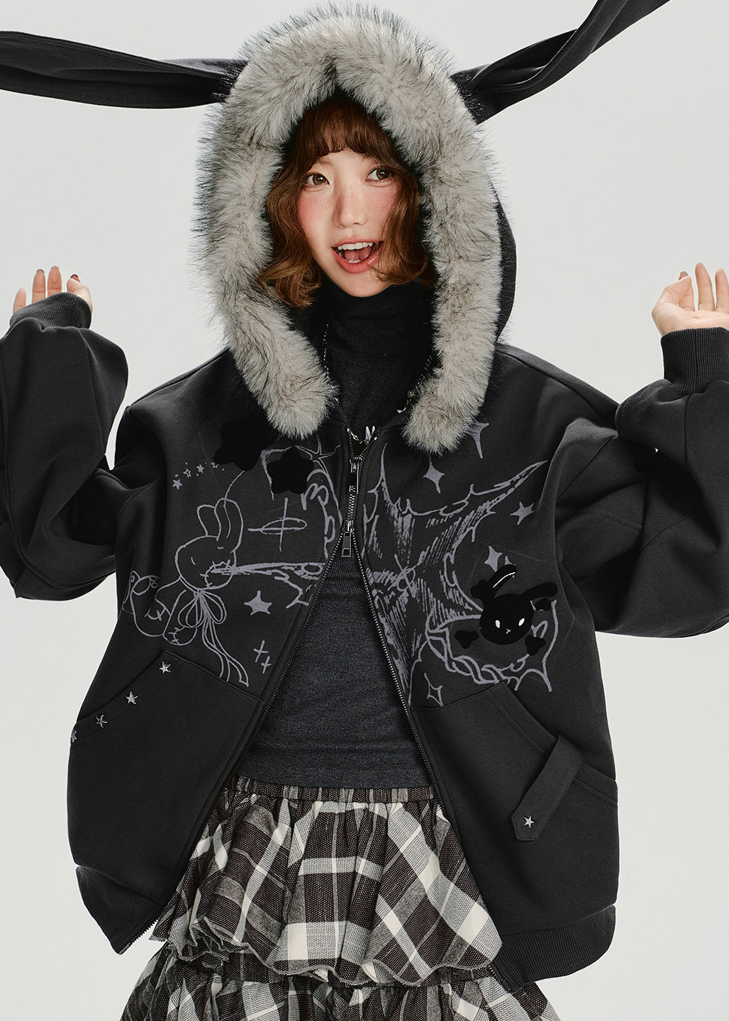 Novelty Pink Zip Up Fur Collar Patchwork Cotton Hooded Jacket Spring