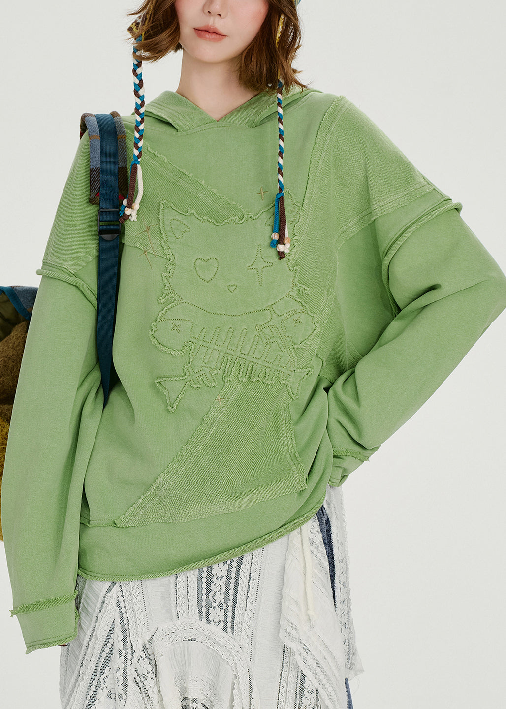 French Green Embroidered Hooded Cotton Loose Sweatshirts Top Spring