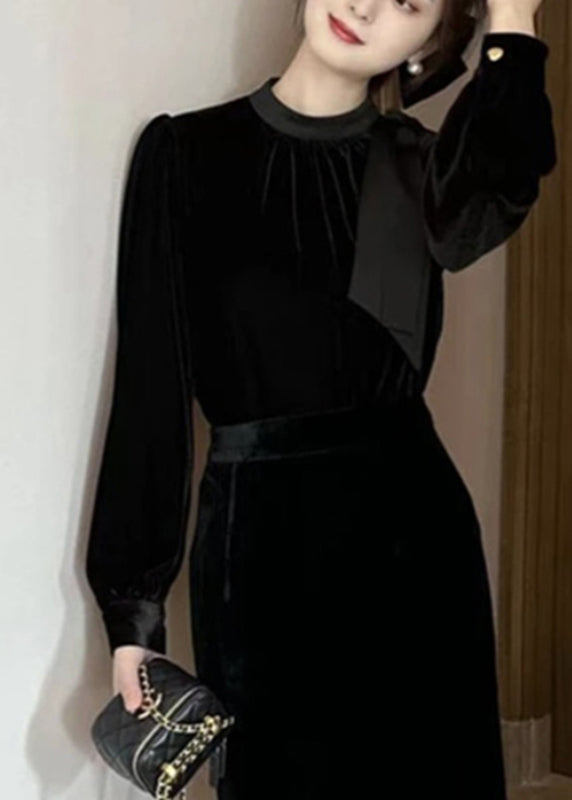 French Pink Bow Wrinkled Silk Velour Shirts Puff Sleeve