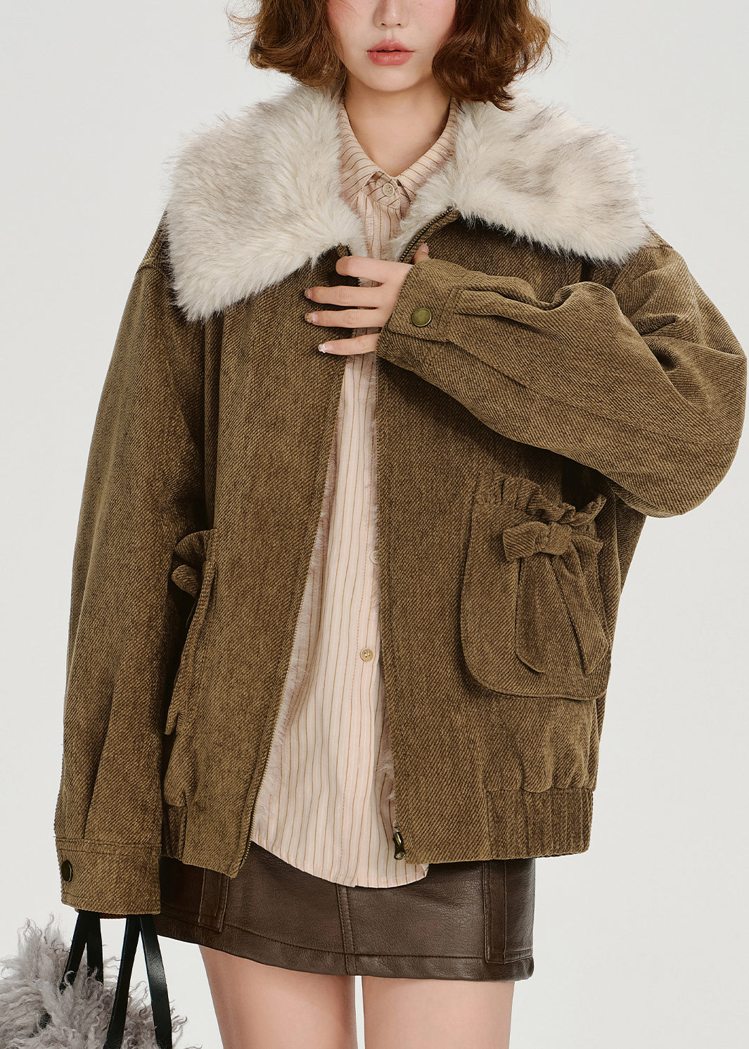 Loose Brown Pockets Fur Collar Patchwork Cotton Filled Jackets Winter