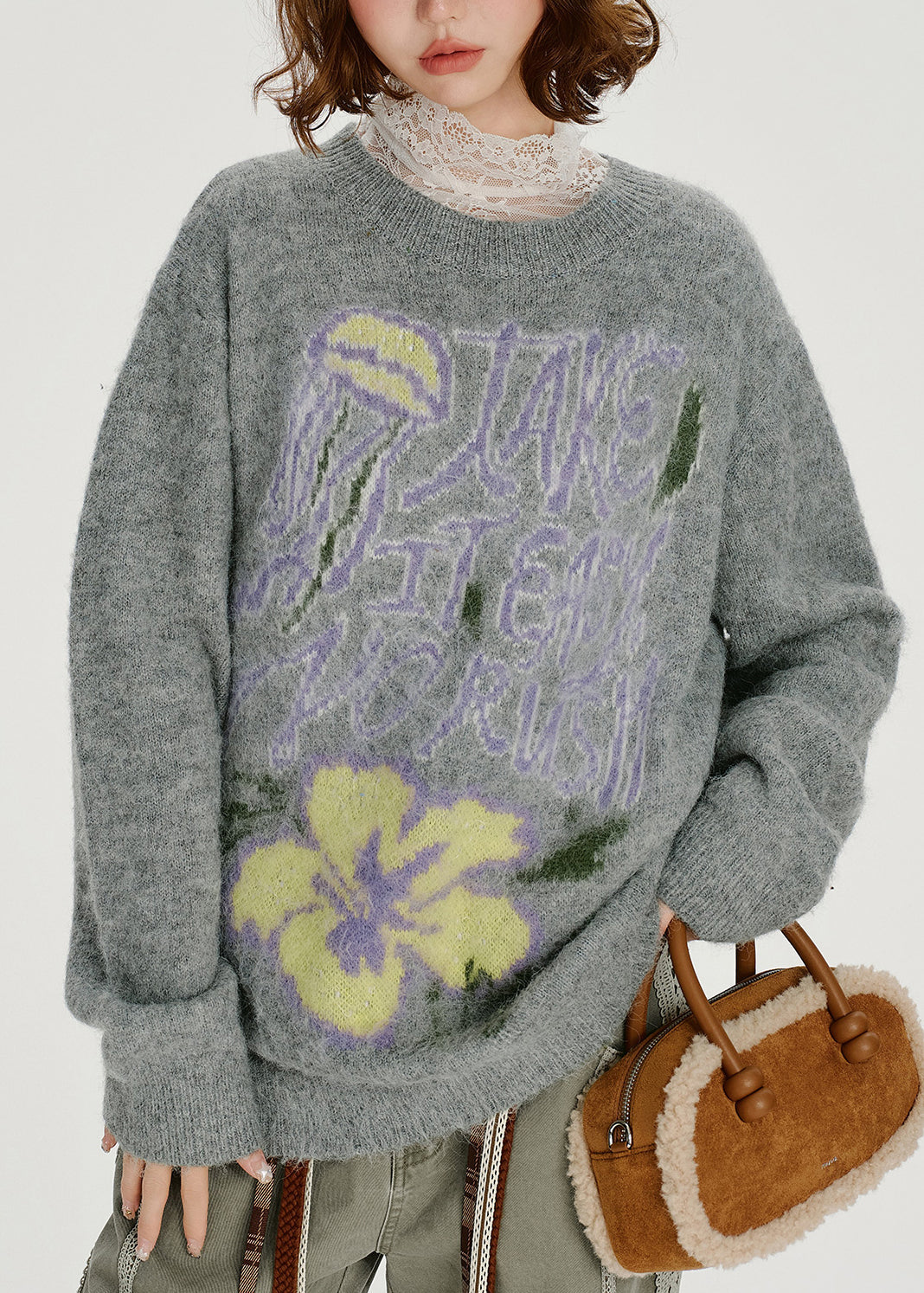 Loose Grey O Neck Thick Jacquard Knit Sweater Tops Winter