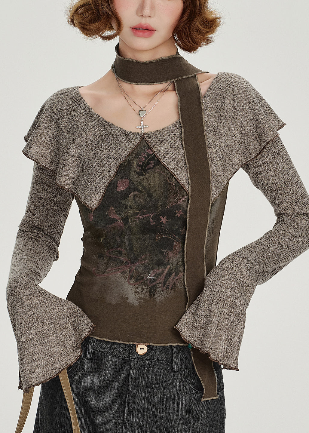 Unique Chocolate Peter Pan Collar Print Top Flare Sleeve