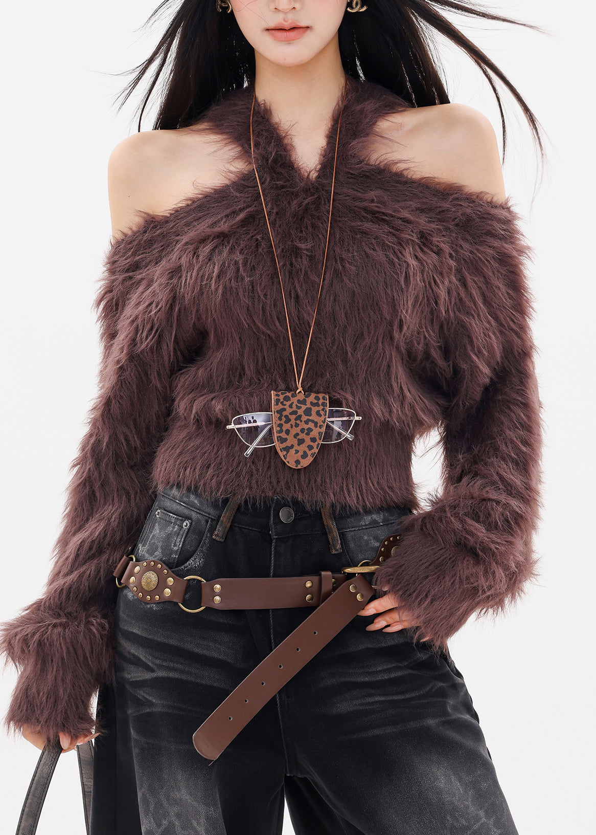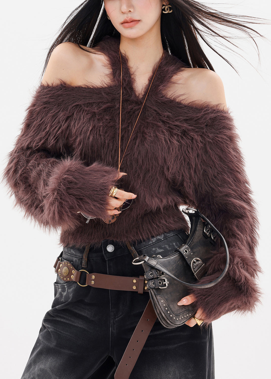 Unique Coffee Cold Shoulder Thick Solid Cotton Knit Sweater Tops Fall