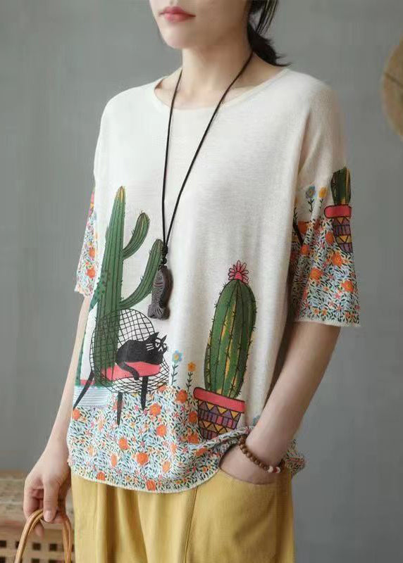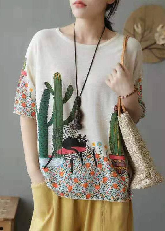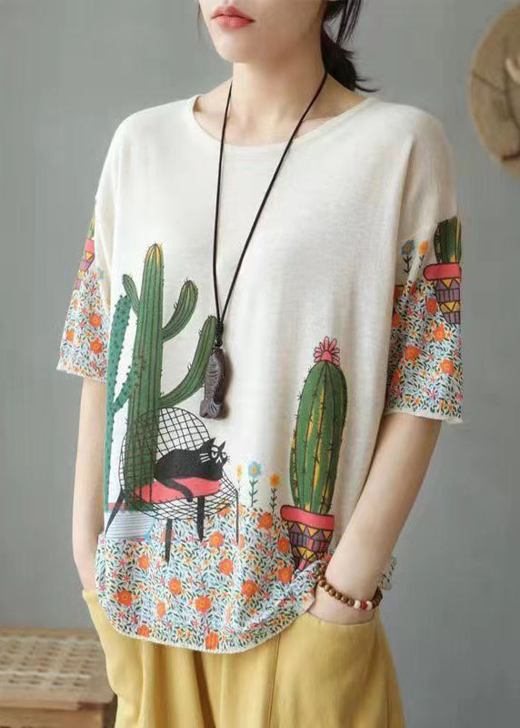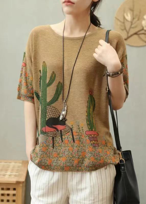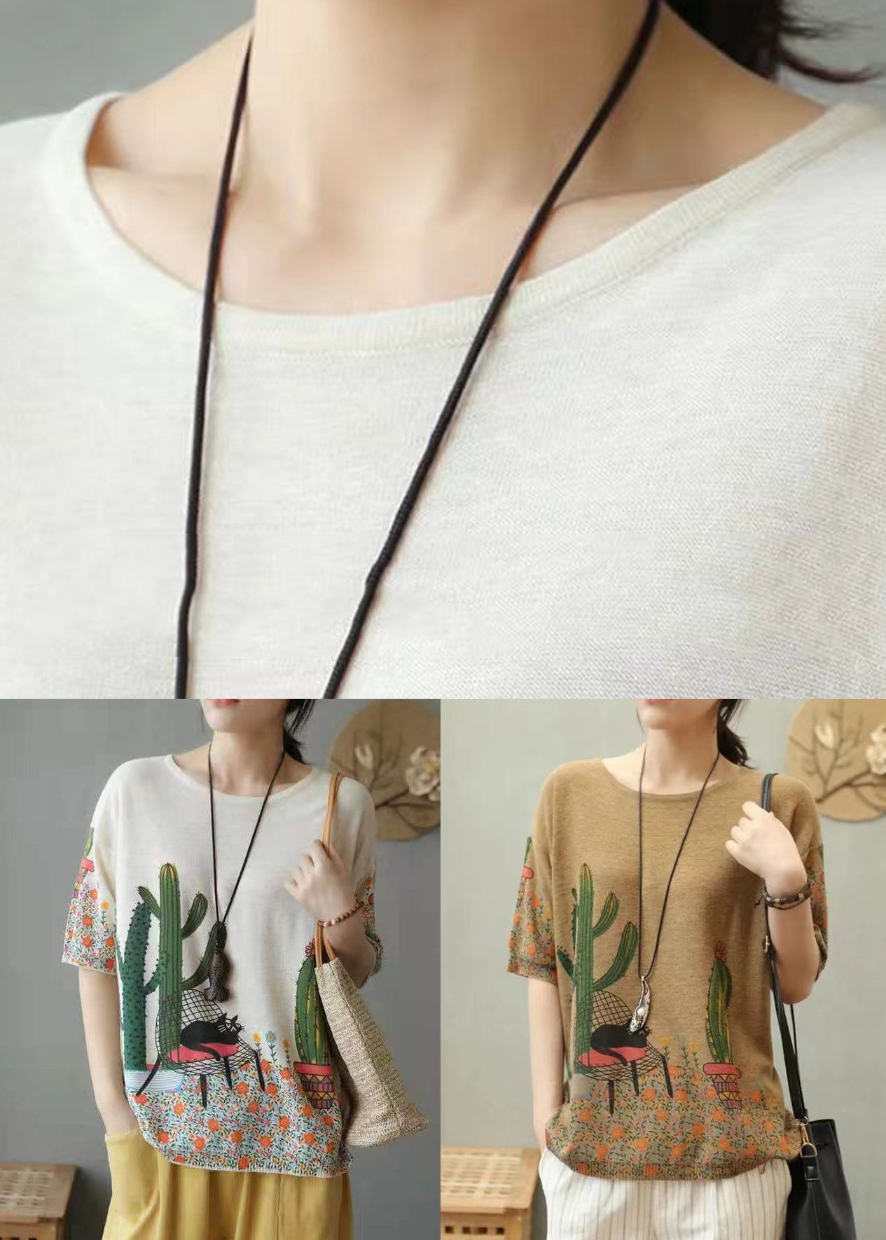 Beige Cozy Patchwork Cotton Knit Top O Neck T Short Short Sleeve
