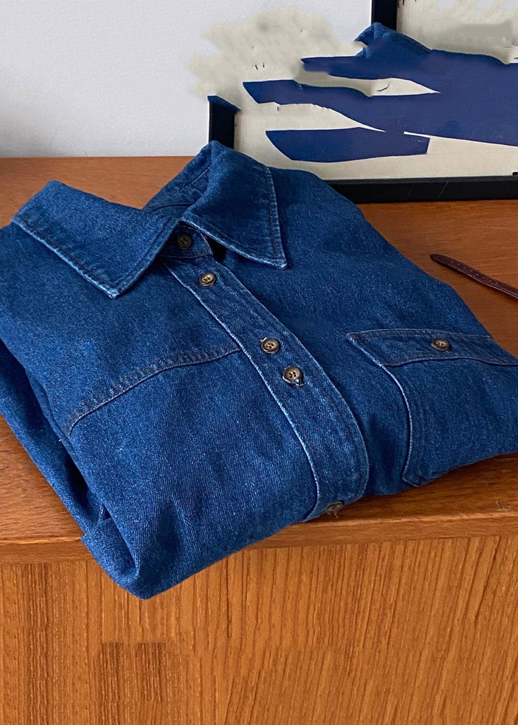 French Blue Peter Pan Collar Button Pockets Denim Shirts Fall