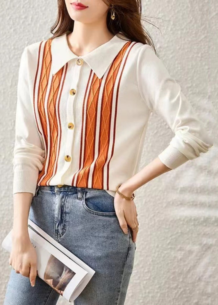 French White Peter Pan Collar Striped Patchwork Knit Sweaters Fall