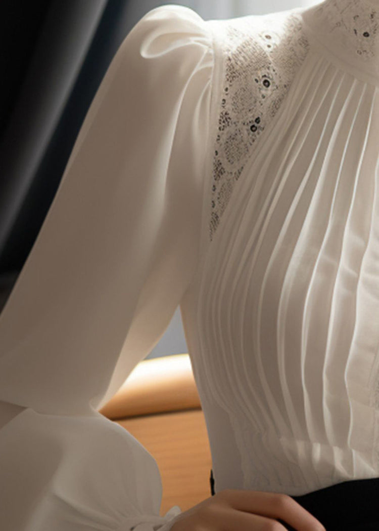 French White Puff Sleeve Lace Wrinkled Patchwork Cotton Top