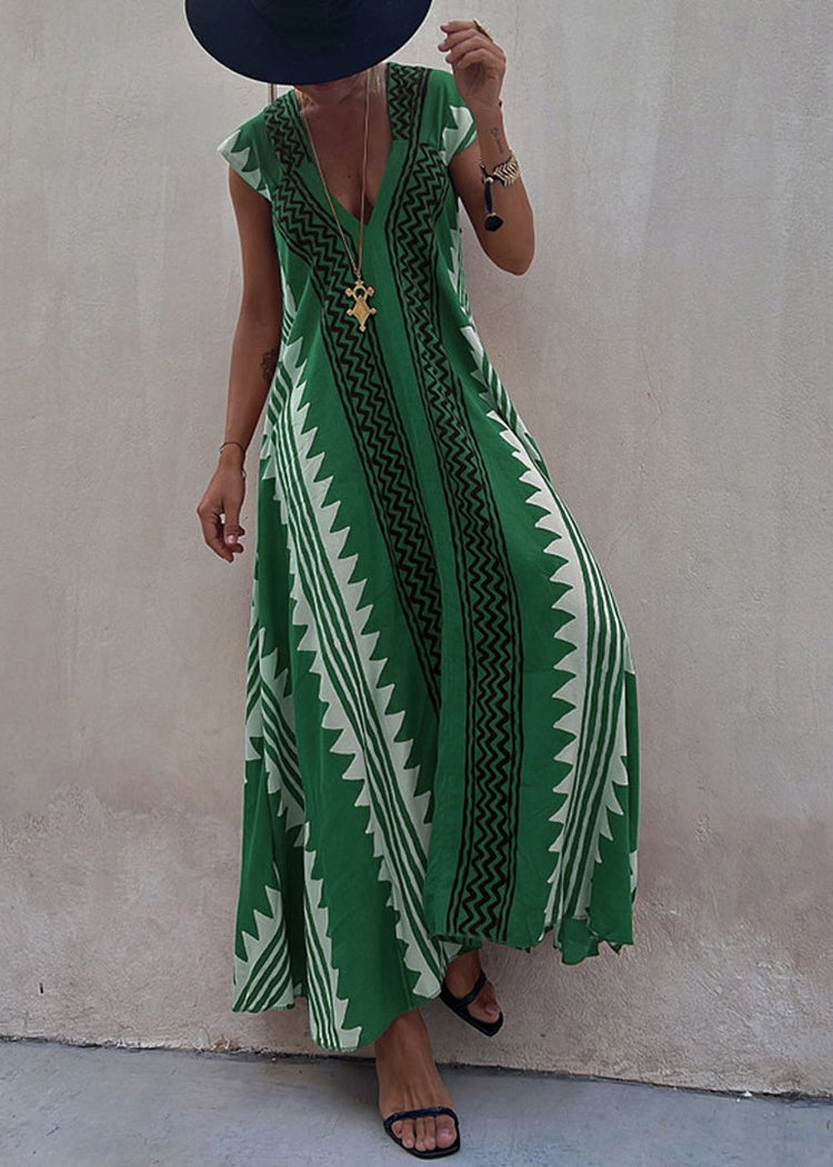 Green Print Chiffon Long Dress Asymmetrical Summer