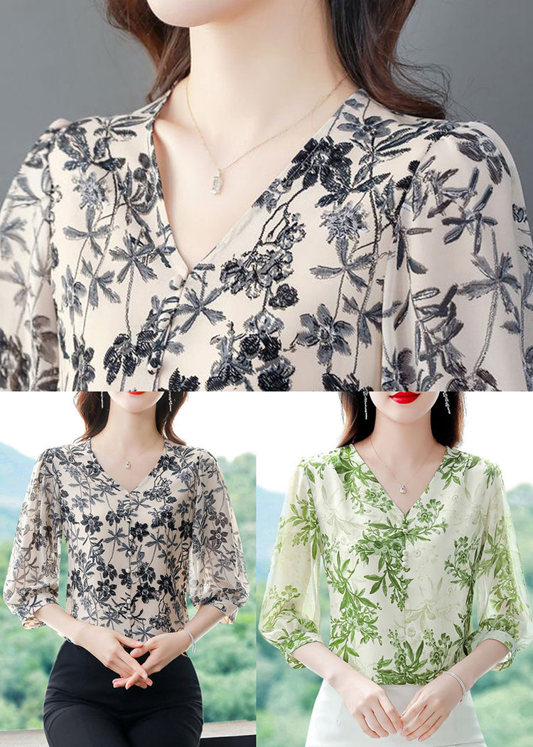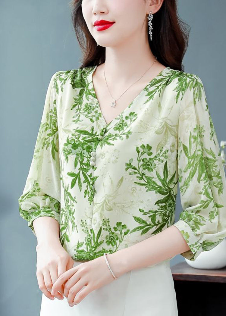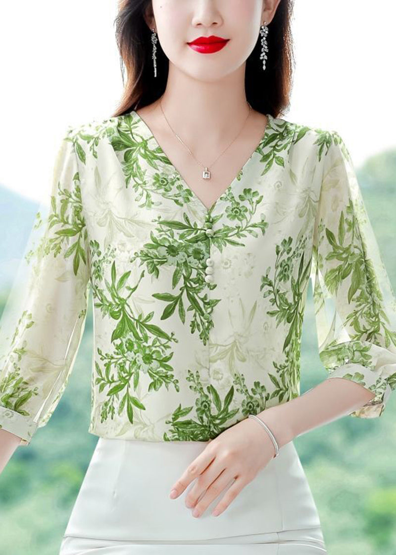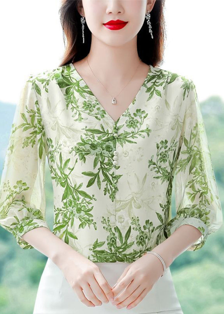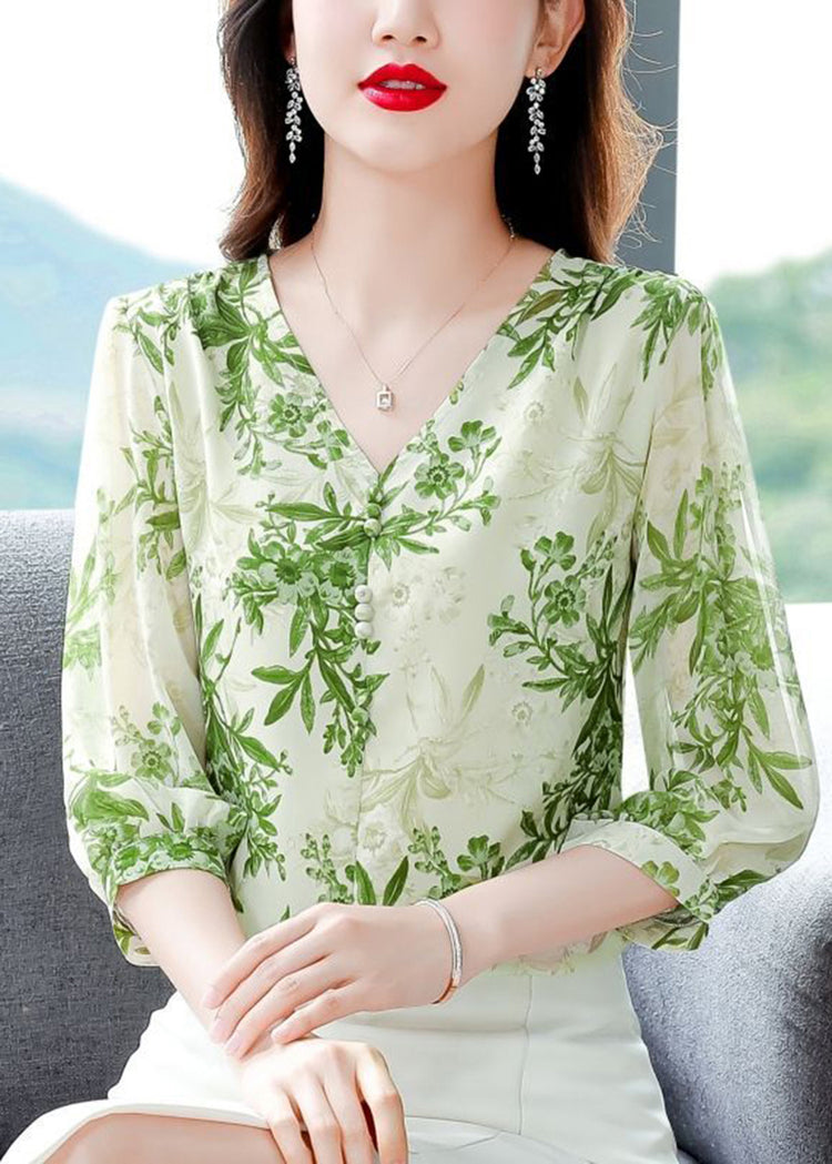 Green Print Chiffon Shirt Top V Neck Button Half Sleeve