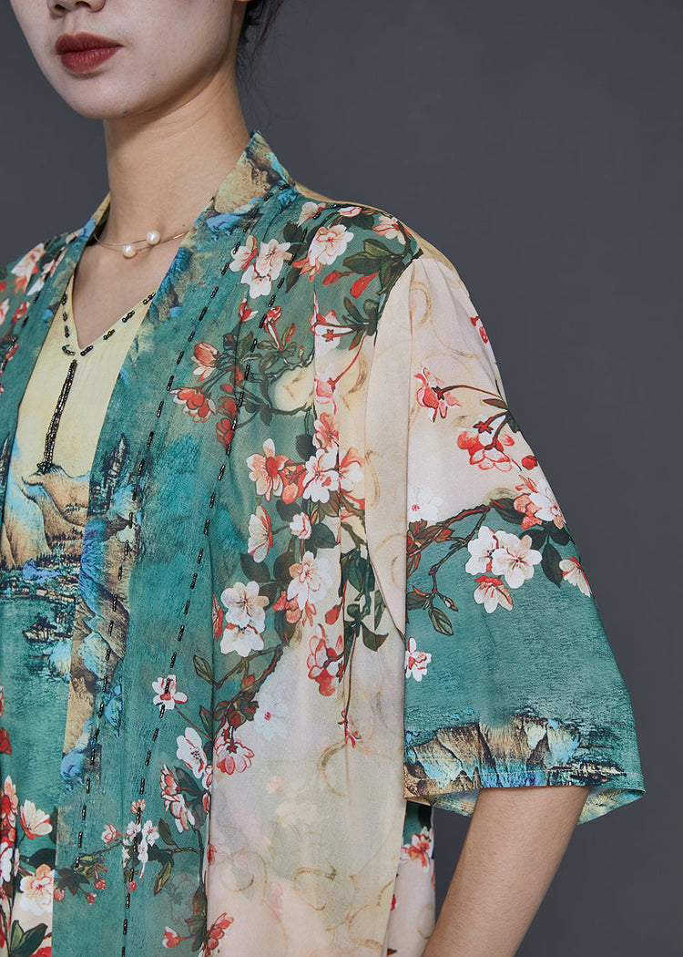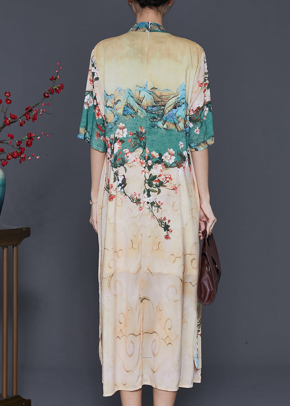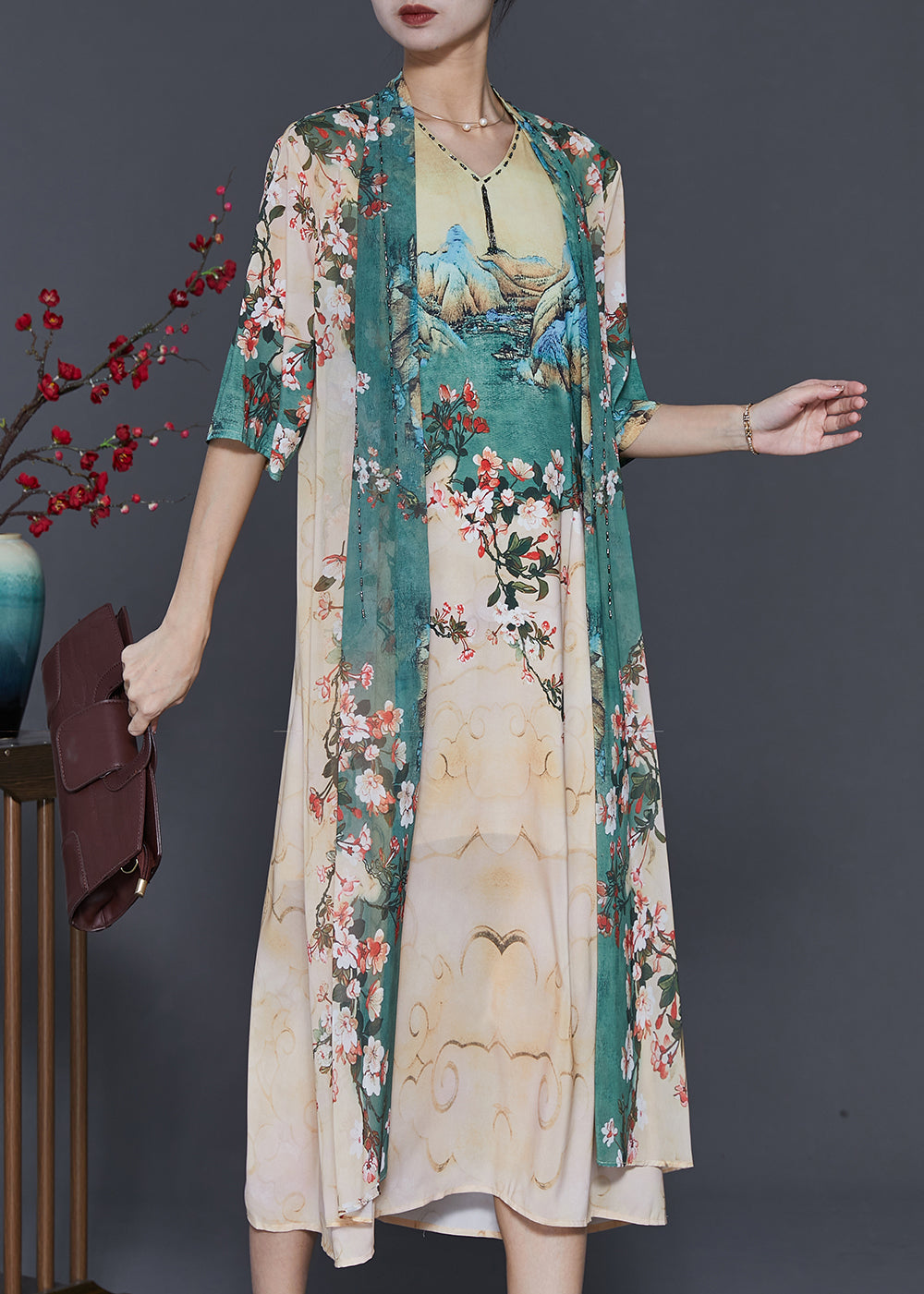 Handmade Apricot Print Chiffon Fake Two Piece Dresses Spring