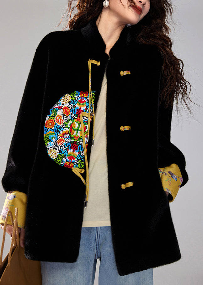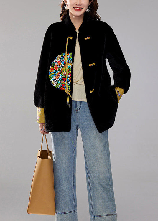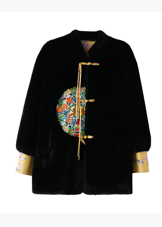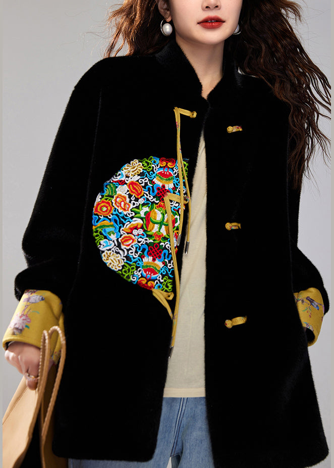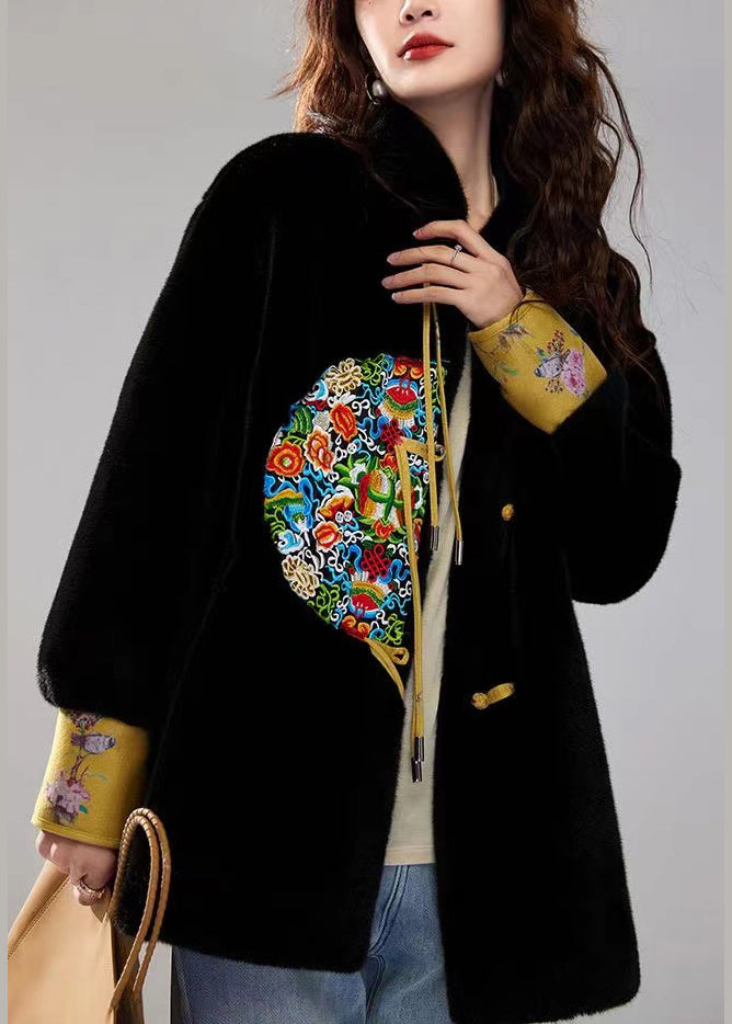 Chinese Style Black Tasseled Embroidered Leather And Fur Coats Spring