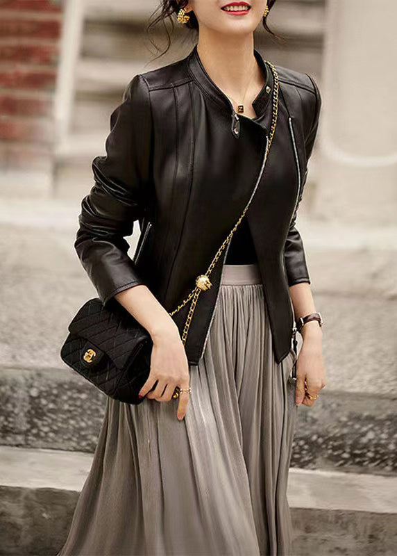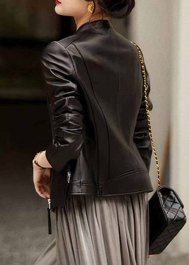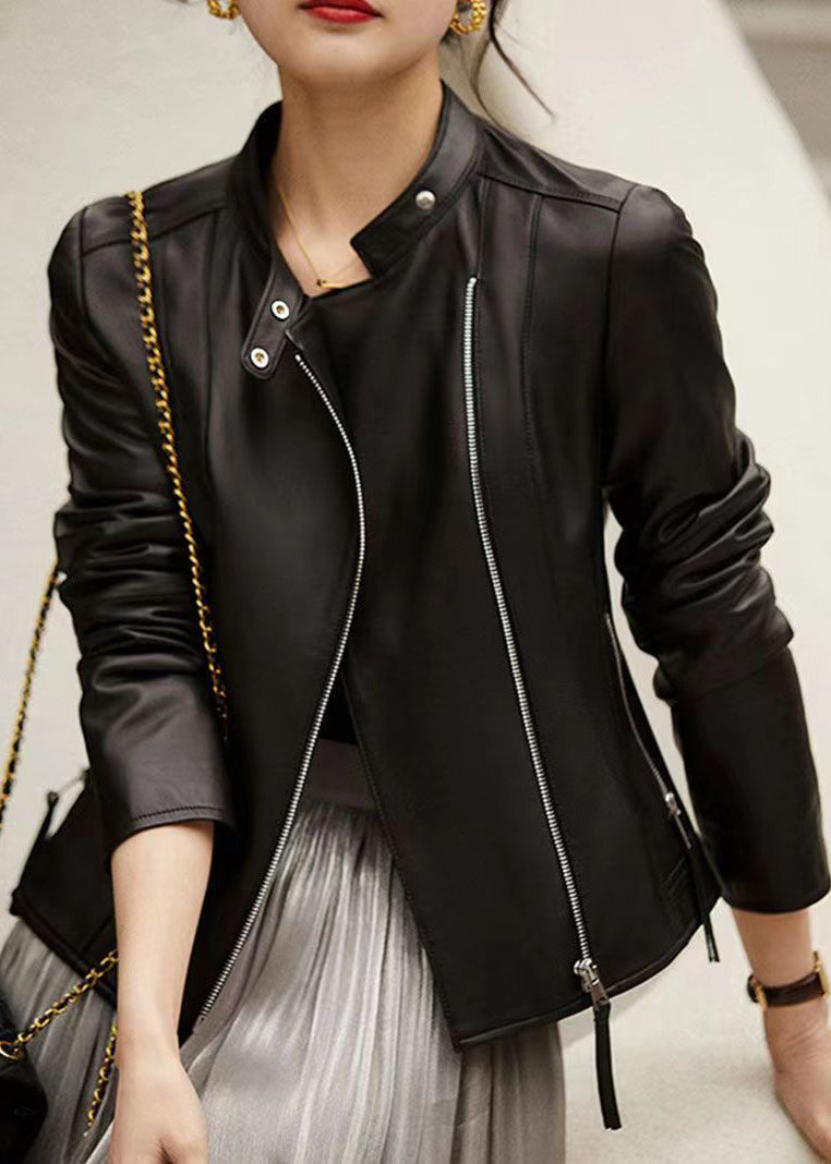 Fine Black Stand Collar Zip Up Pockets Patchwork Sheepskin Jackets Fall