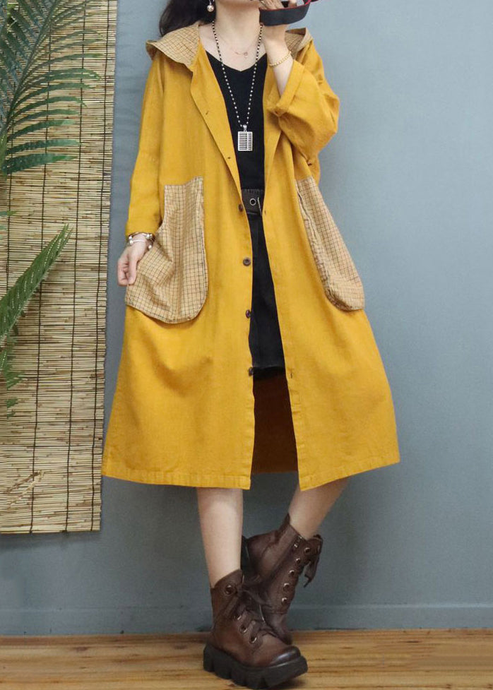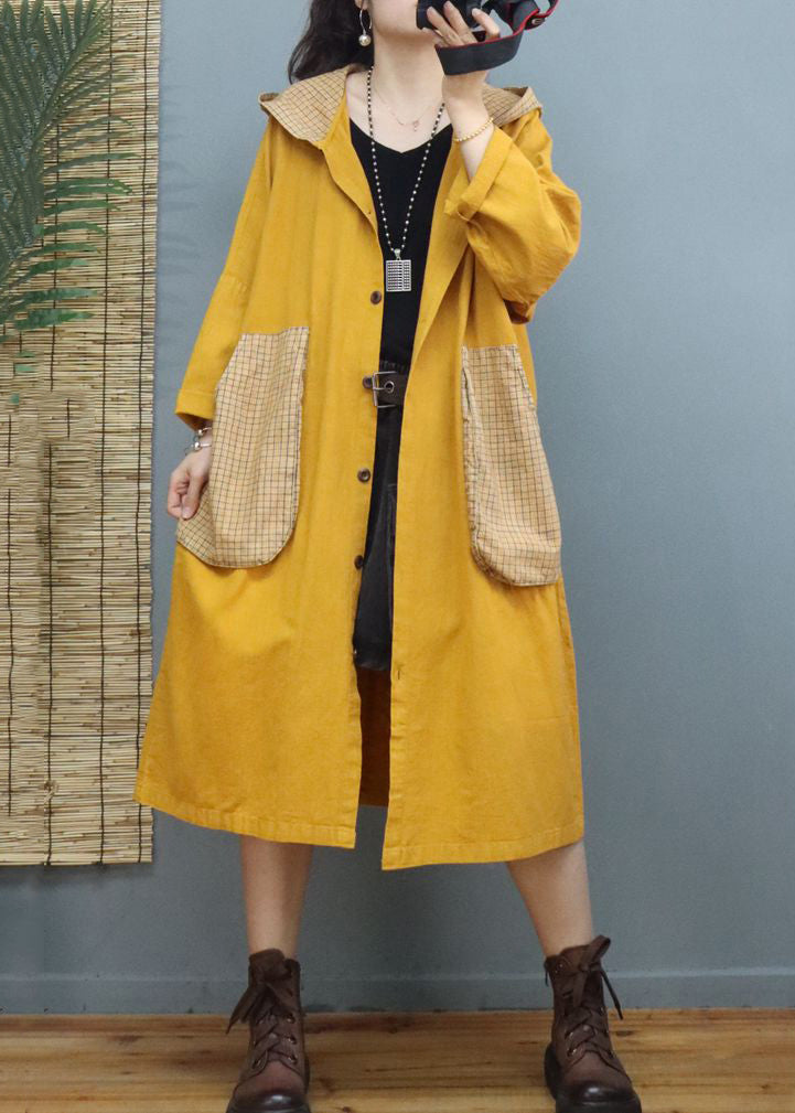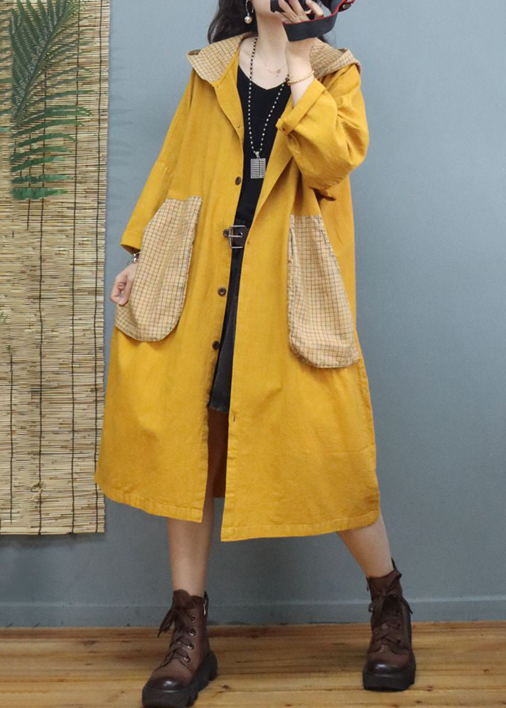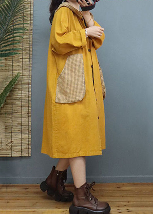 Yellow Button Patchwork Long Cotton Coats Hooded Long Sleeve