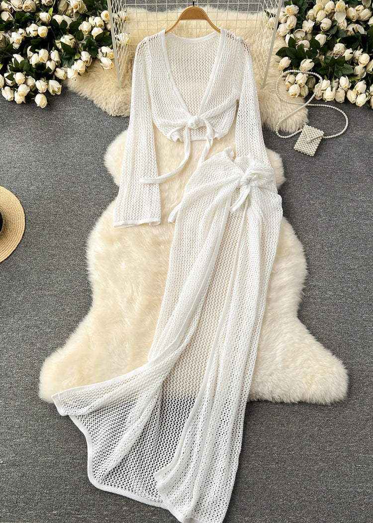 French Blue Hollow Out Tops And Side Open Skirts Knit Two Pieces Set Fall