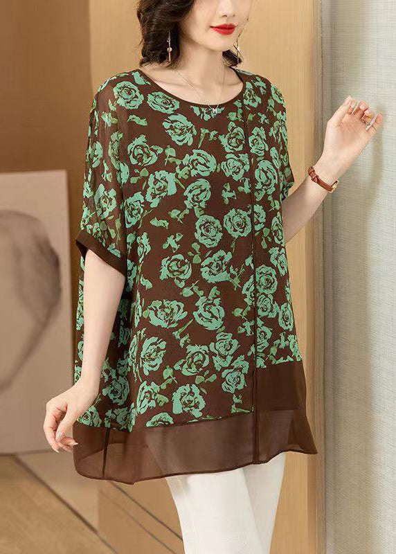 Women Green O Neck Print Patchwork Chiffon T Shirt Summer
