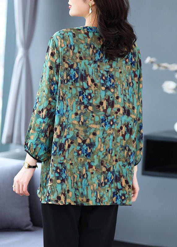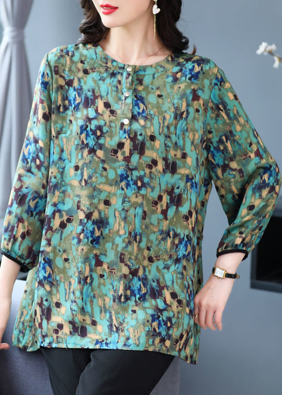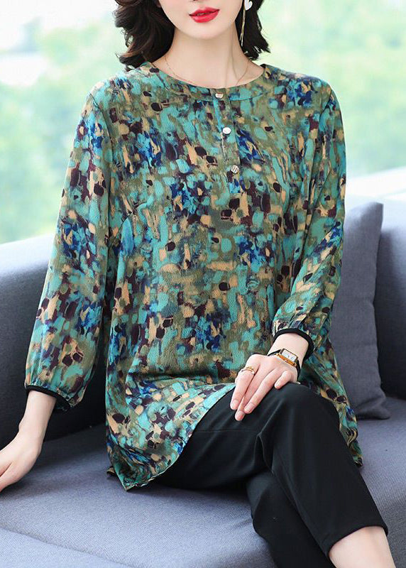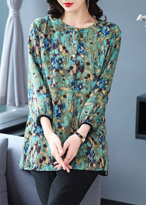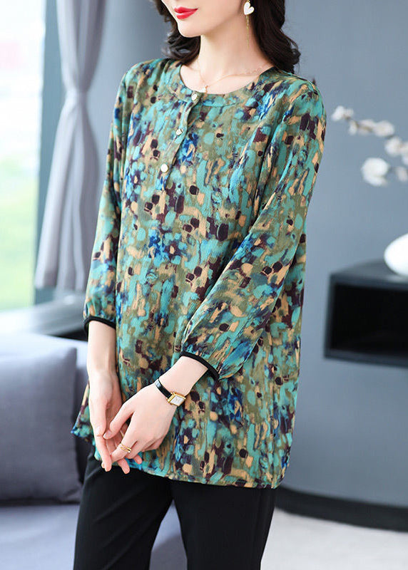 Elegant Blackish Green O Neck Print Patchwork Silk Top Fall