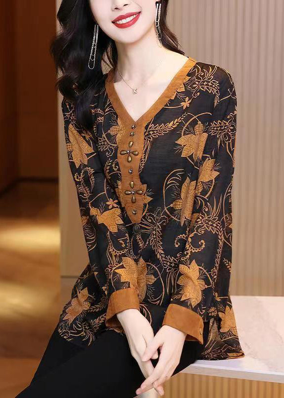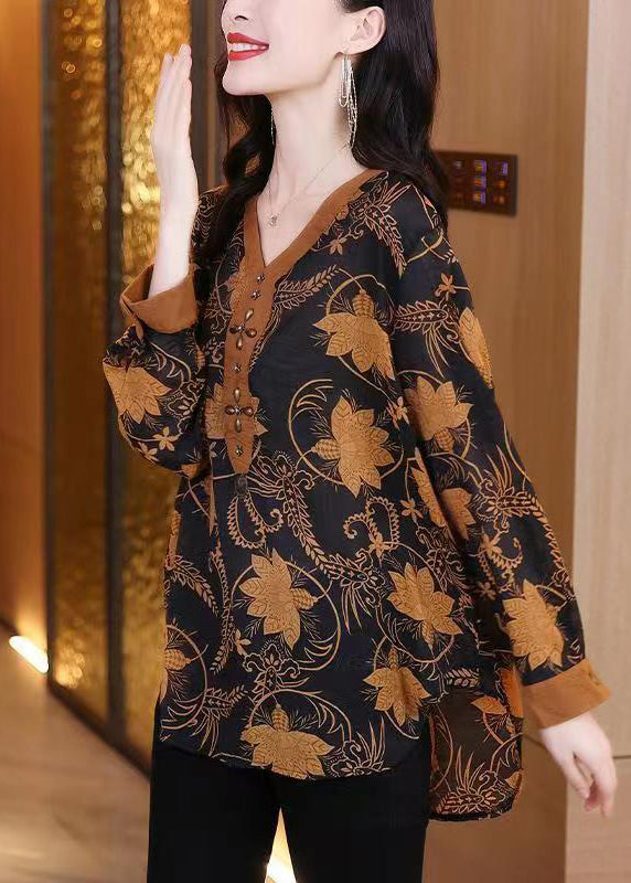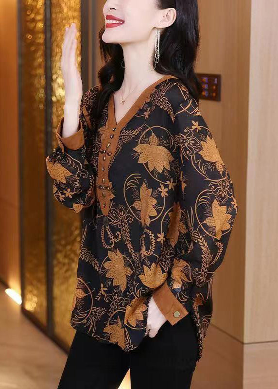 French Coffee V Neck Print Patchwork Chiffon Shirt Top Fall