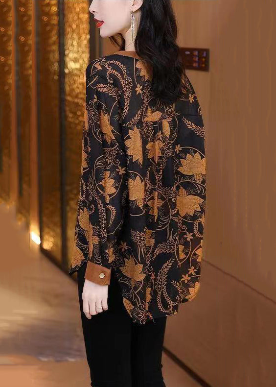 Boutique Black Peter Pan Collar Print Patchwork Silk Velour Shirt Fall