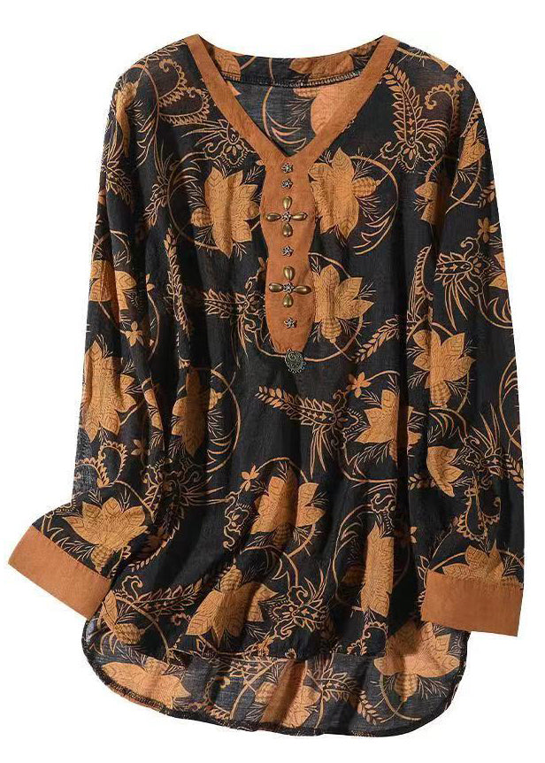 Plus Size Orange V Neck Print Patchwork Cotton Top Fall
