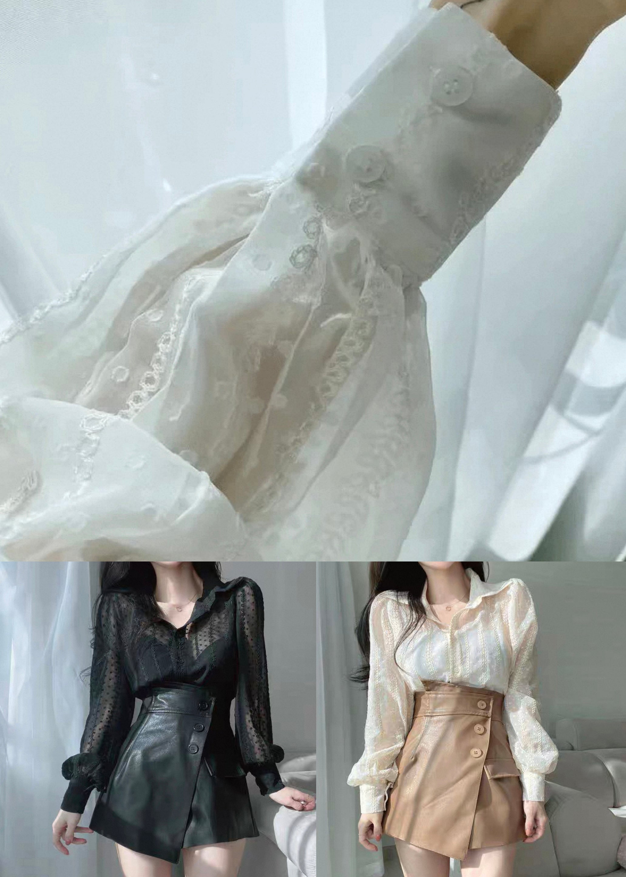 Fashion Beige Lace Button Solid Cotton Shirts Puff Sleeve