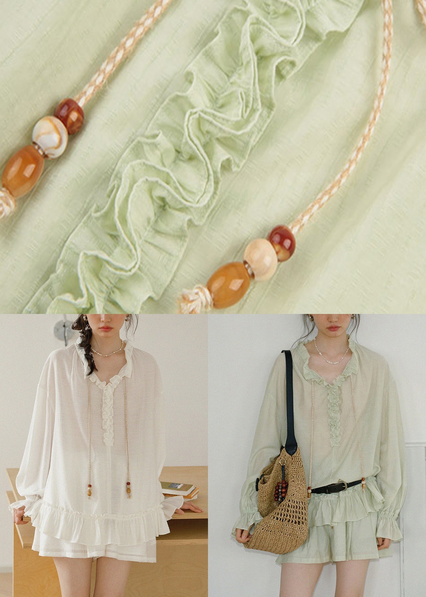 Green Lace Up Pockets Shirts And Shorts Cotton Two-Piece Set Ruffled Fall