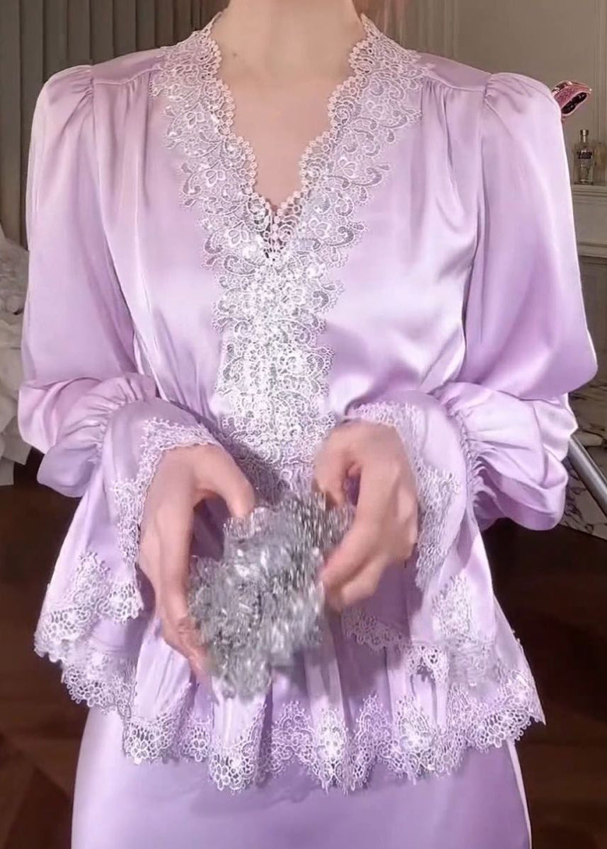 Purple Lace Solid Patchwork Silk Blouse Tops V Neck Fall