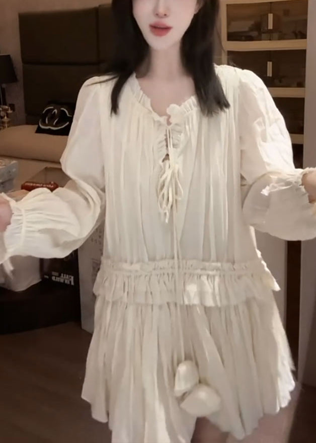 Elegant Beige Ruffled Lace Up Cotton Mini Dress Fall