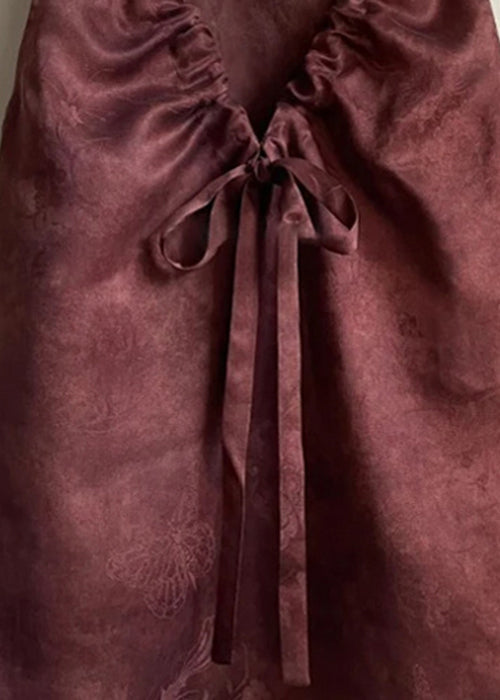 New Red V Neck Wrinkled Lace Up Cotton Mini Dresses Fall