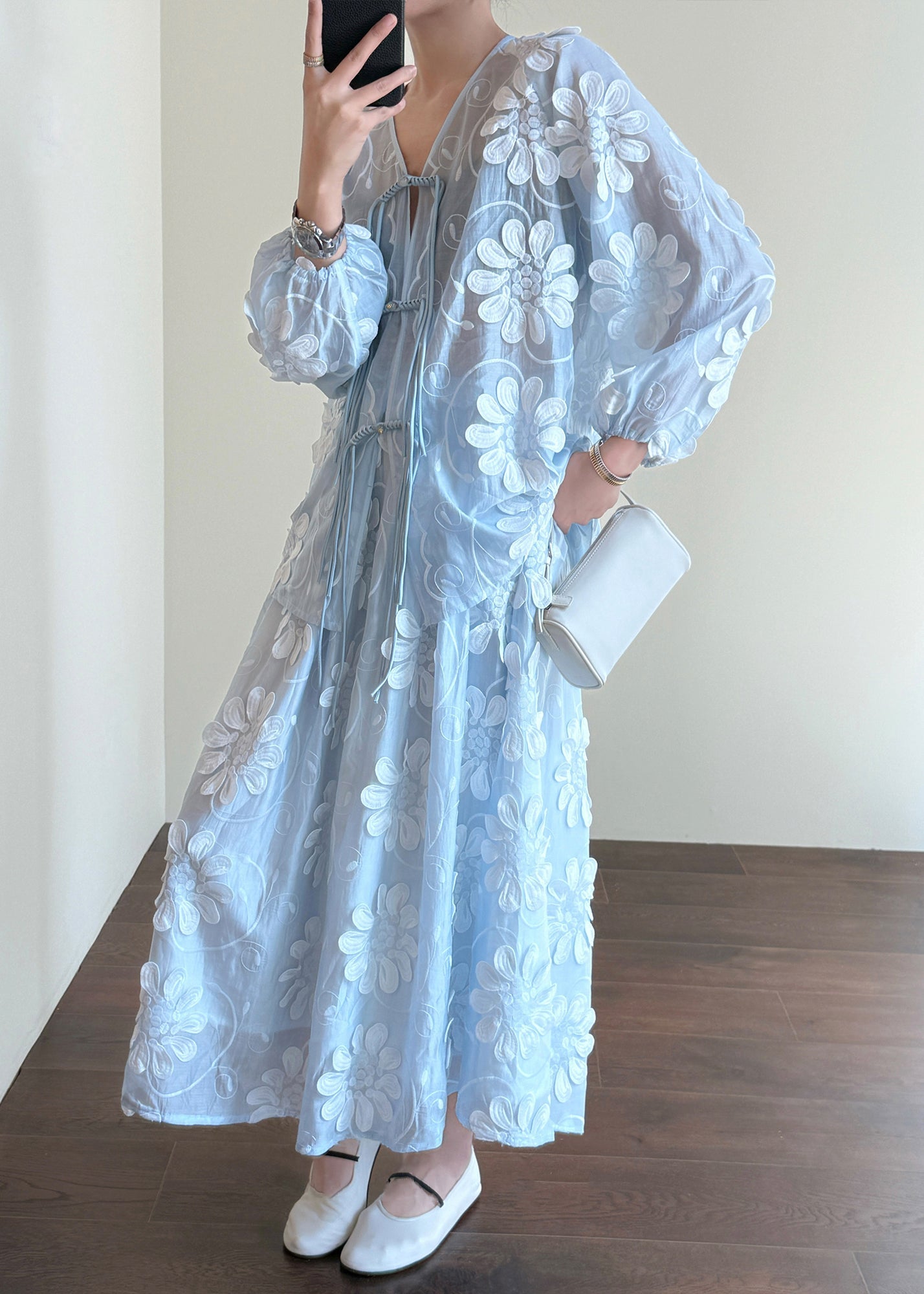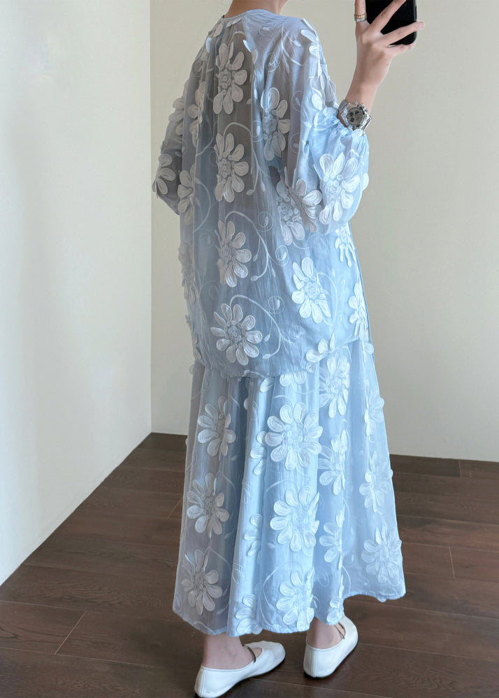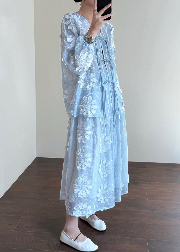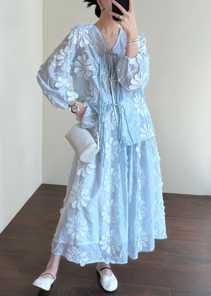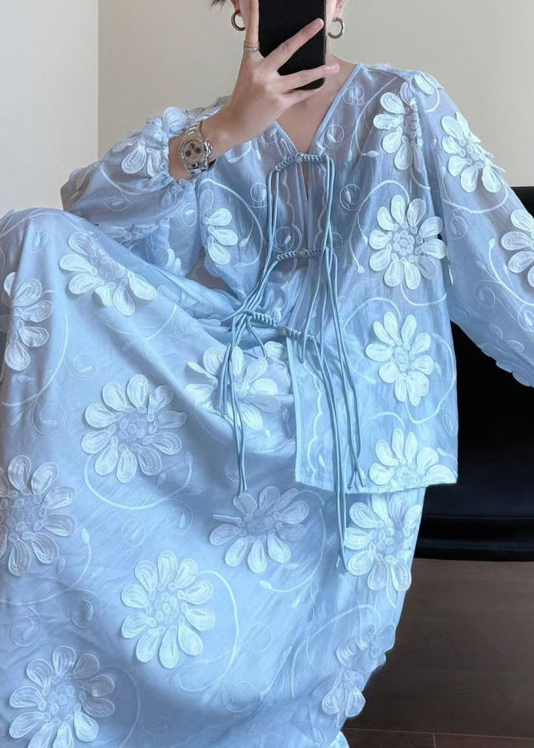 Floral Blue Chinese Button Shirts And Skirts Silk Two-Piece Set Fall