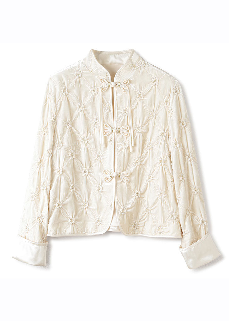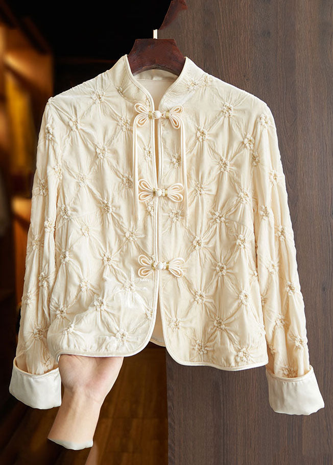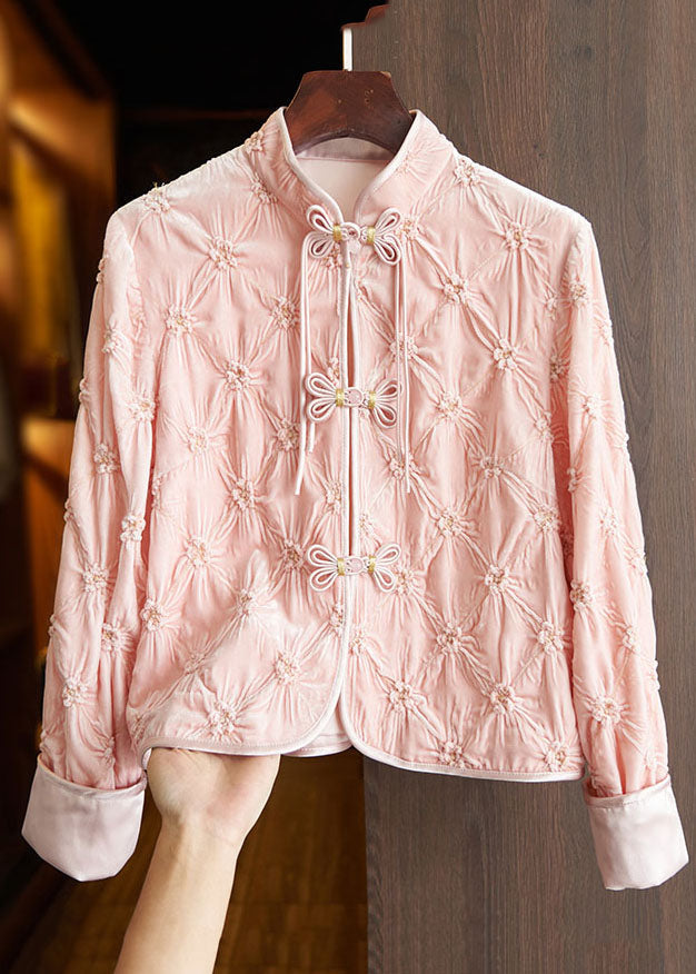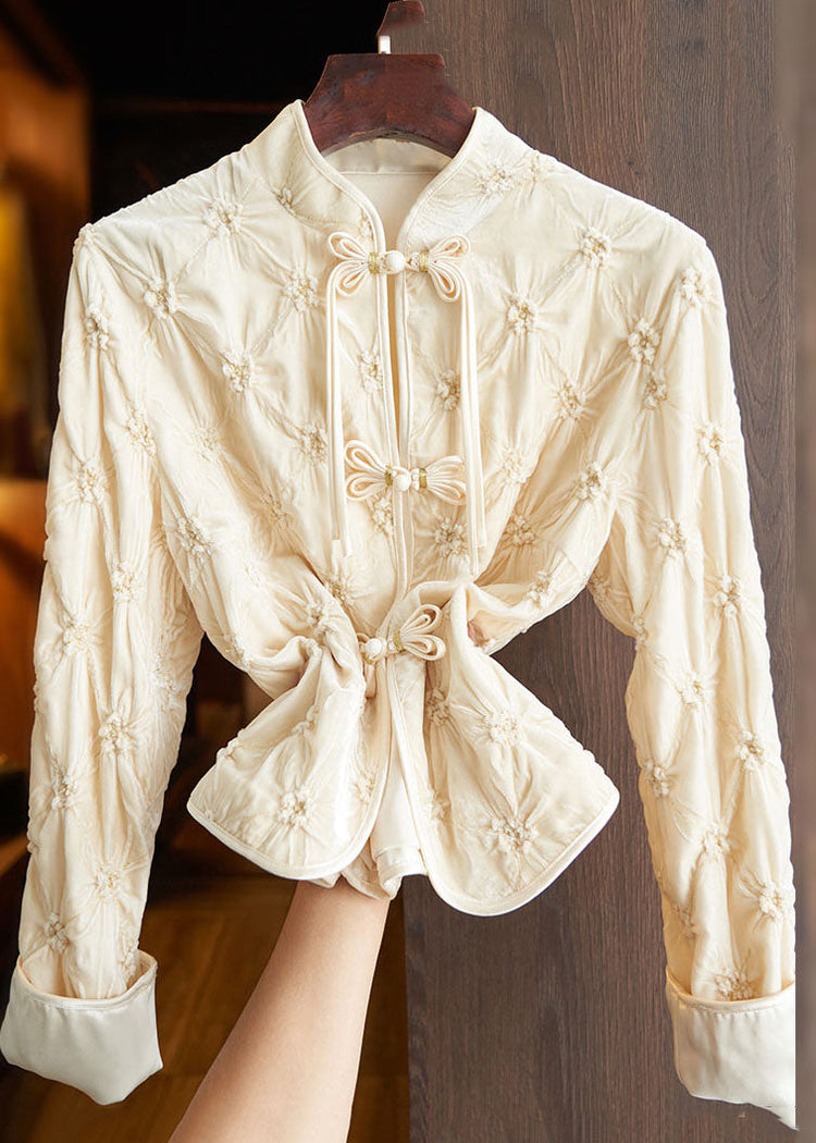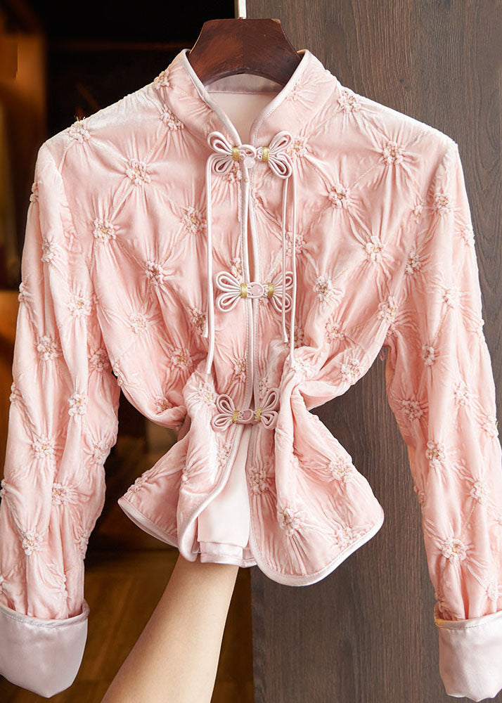 Art Apricot Stand Collar Floral Button Silk Velour Tops Fall