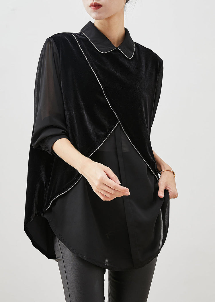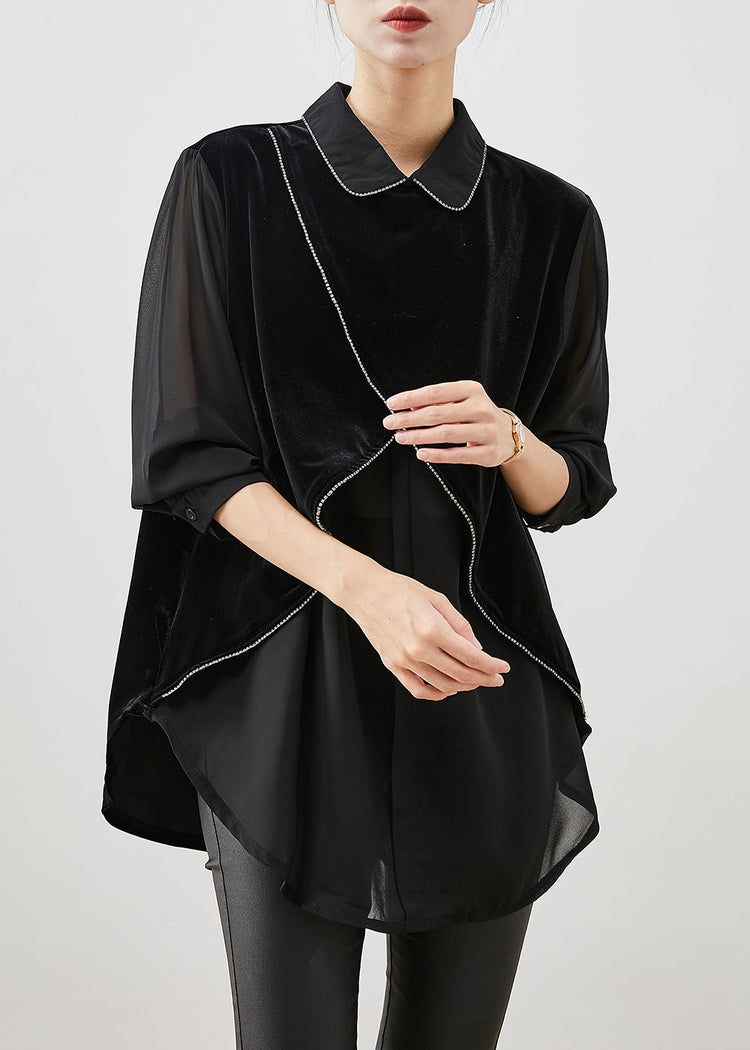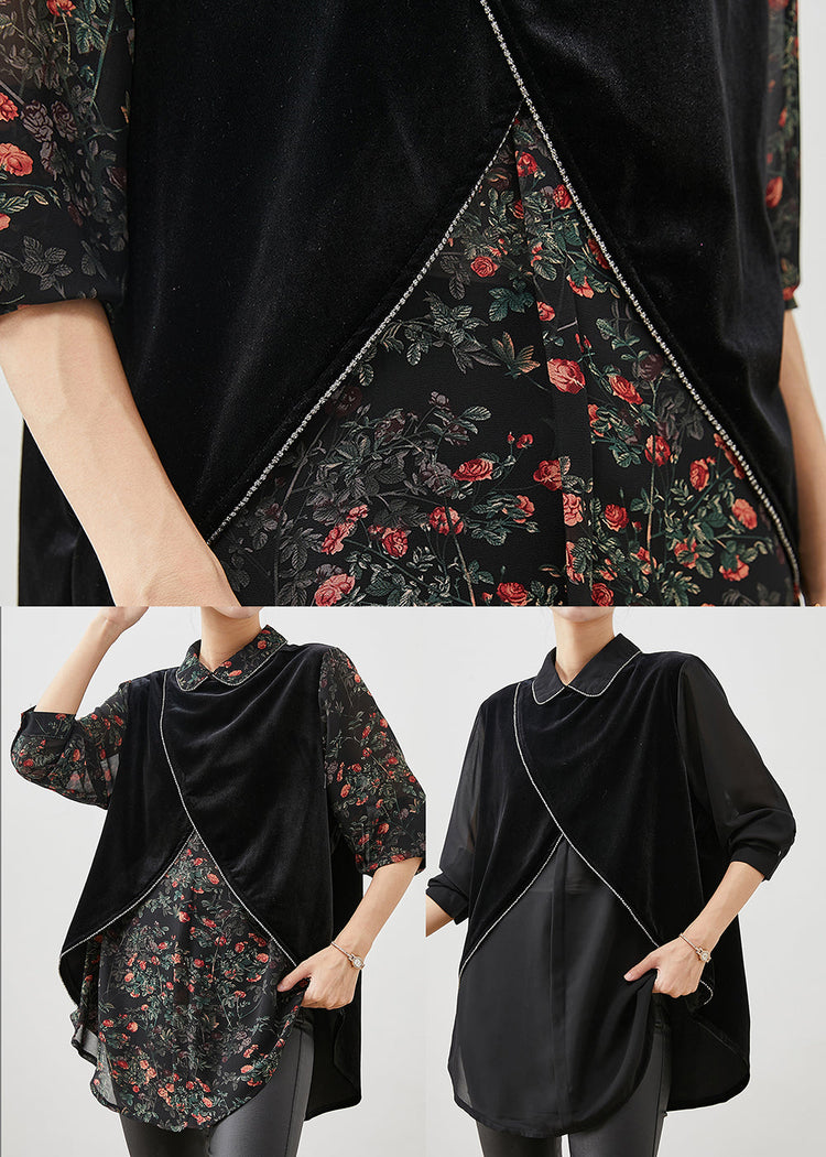 Art Black Asymmetrical Patchwork Silk Velour Blouses Spring