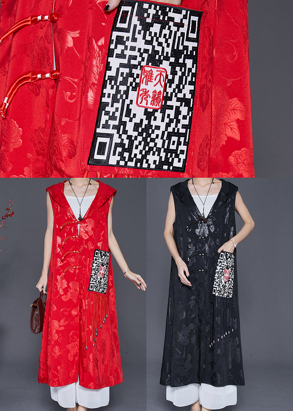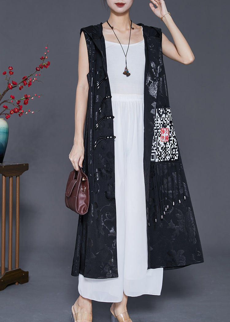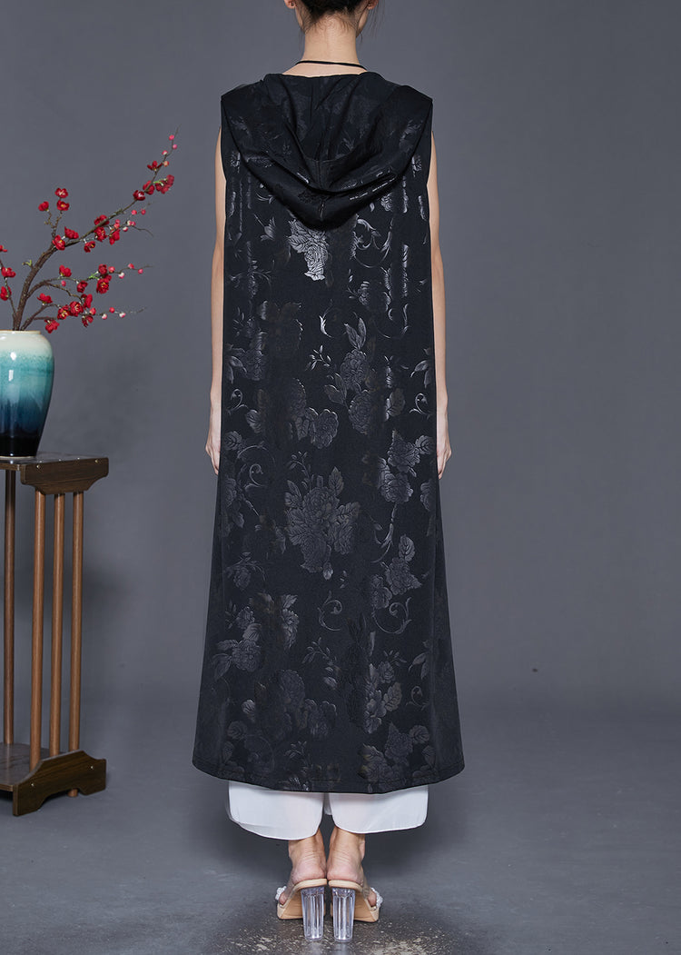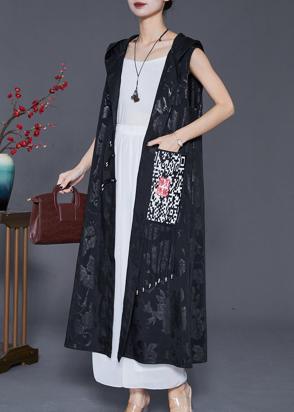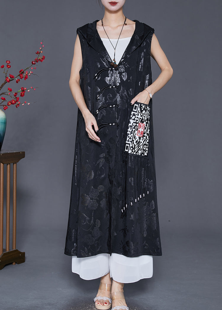 Art Black Hooded Embroidered Silk Long Vest Fall