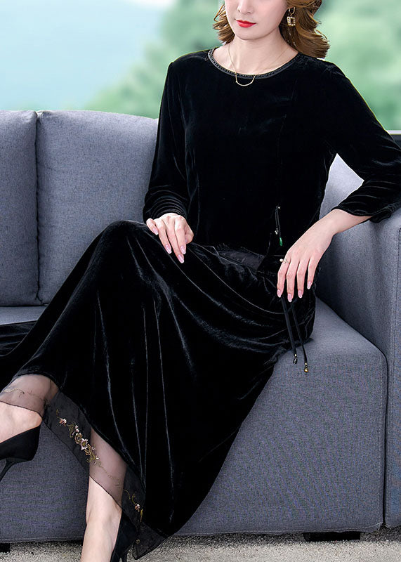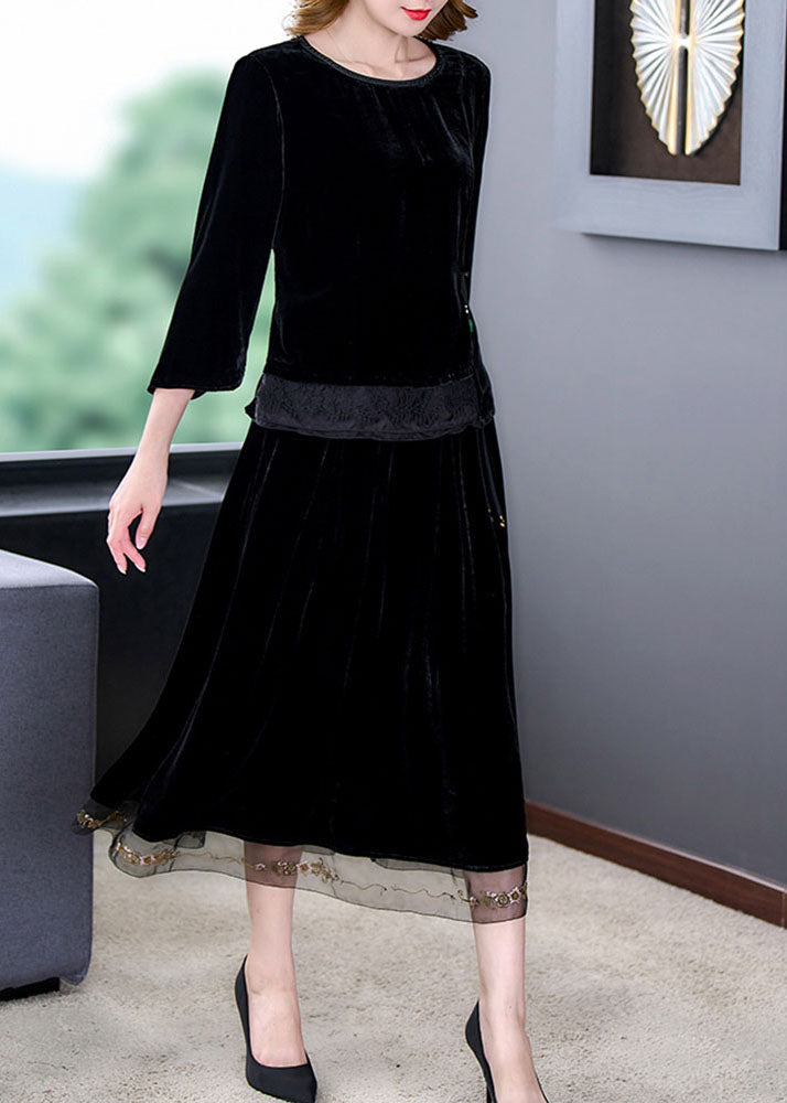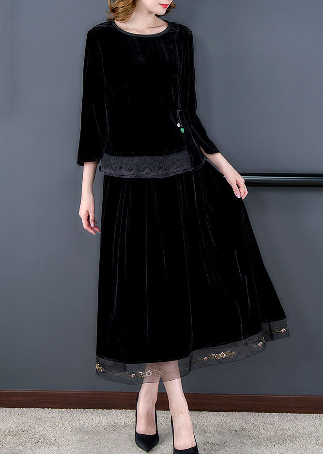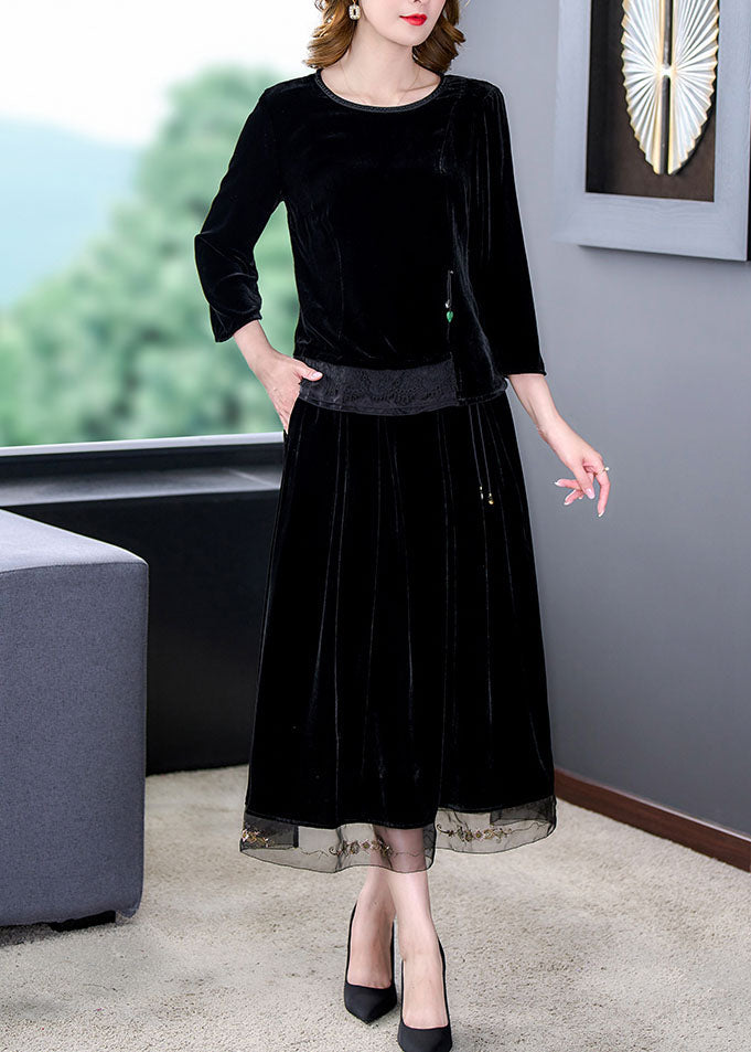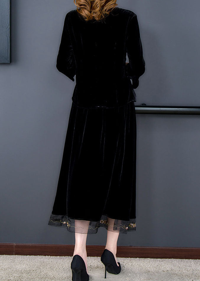 Art Black O-Neck Tulle Patchwork Silk Velour Top And Maxi Skirts Two Pieces Set Long Sleeve