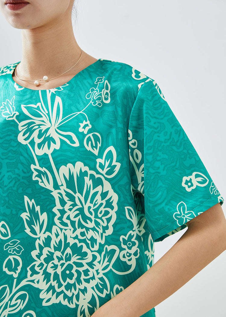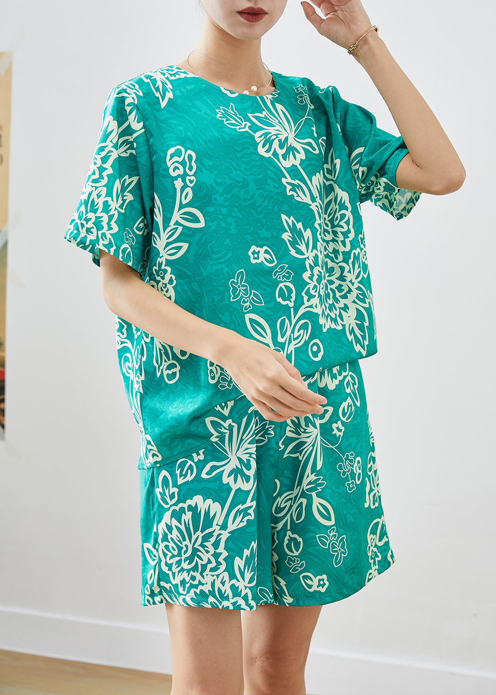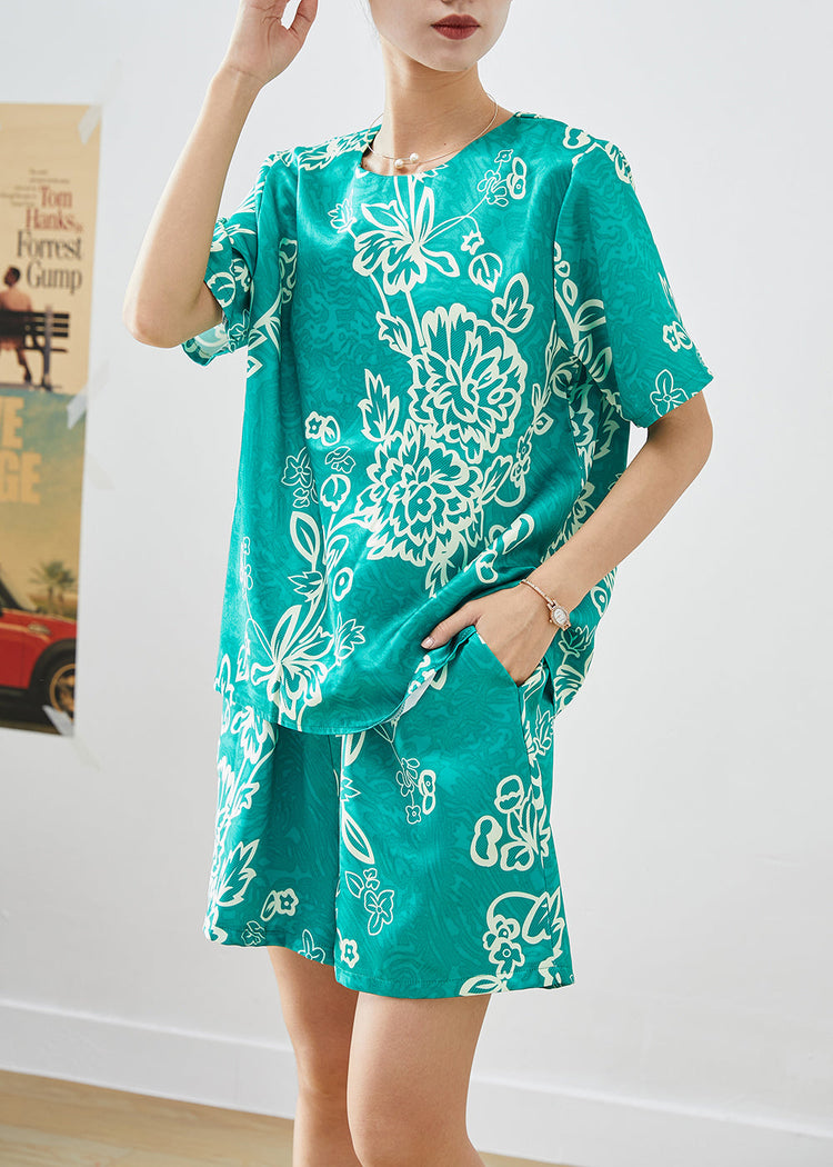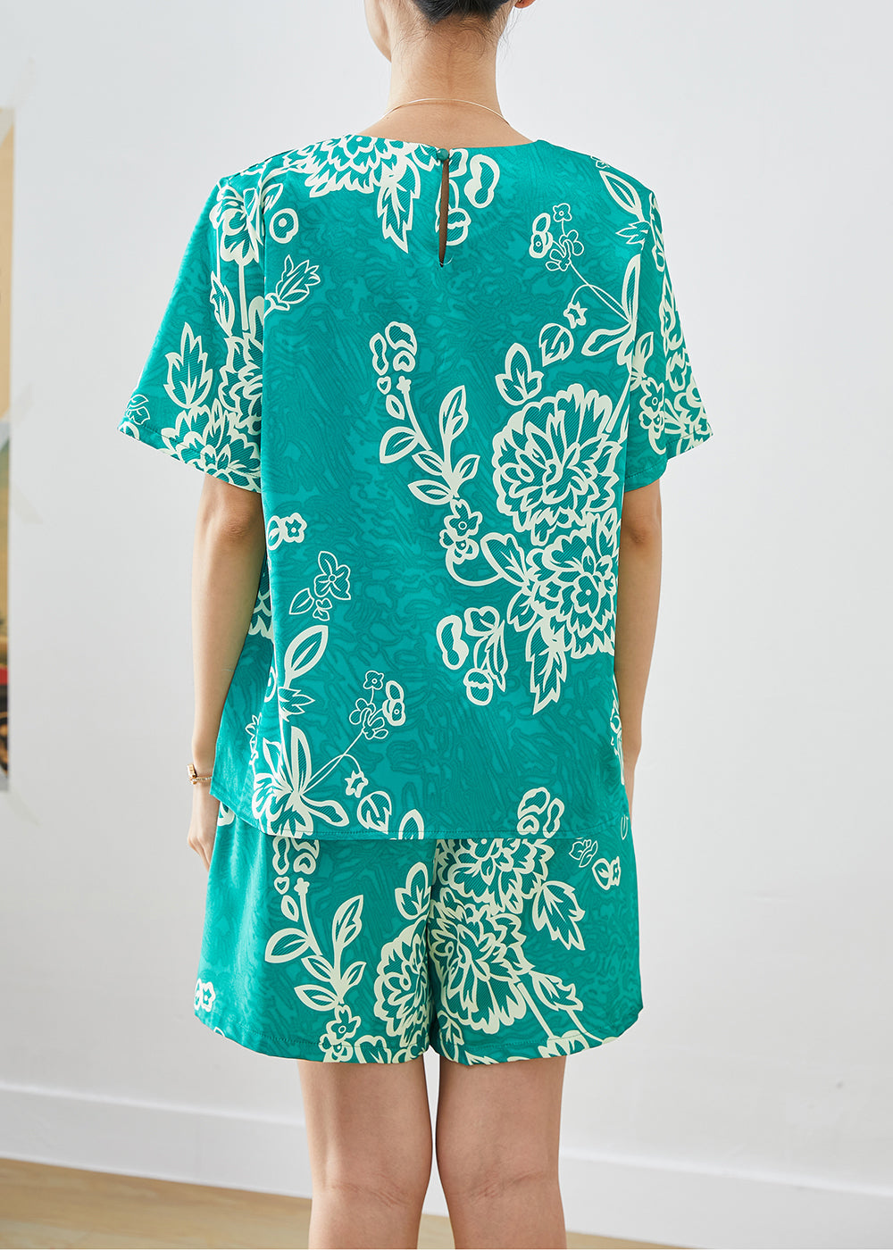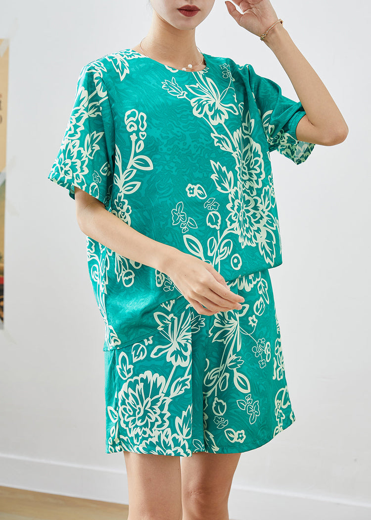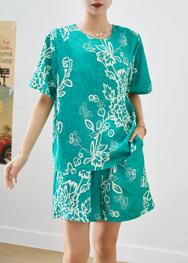 Art Green O-Neck Oversized Print Silk Two Pieces Set Summer