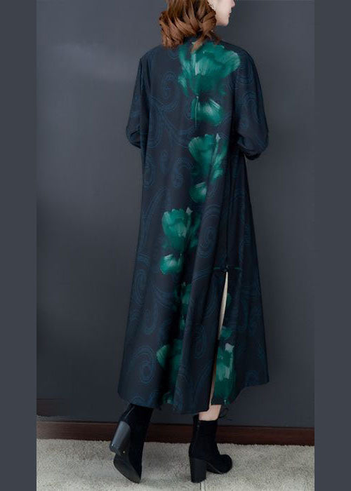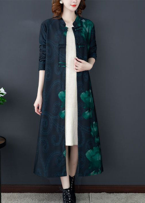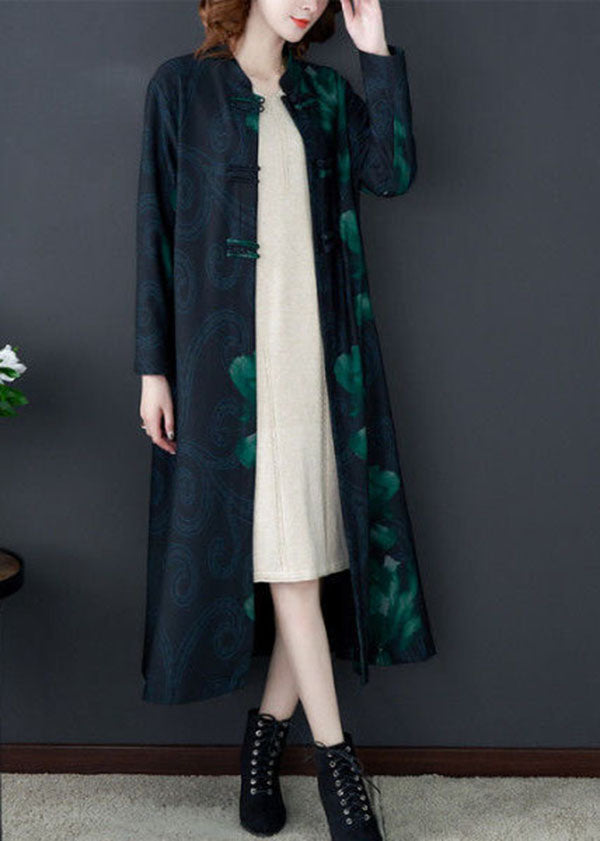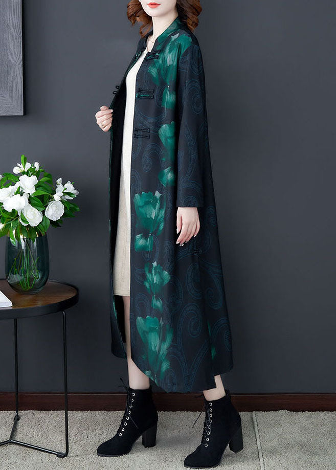 Art Green Stand Collar Print Silk Lengthen Trench Long Sleeve