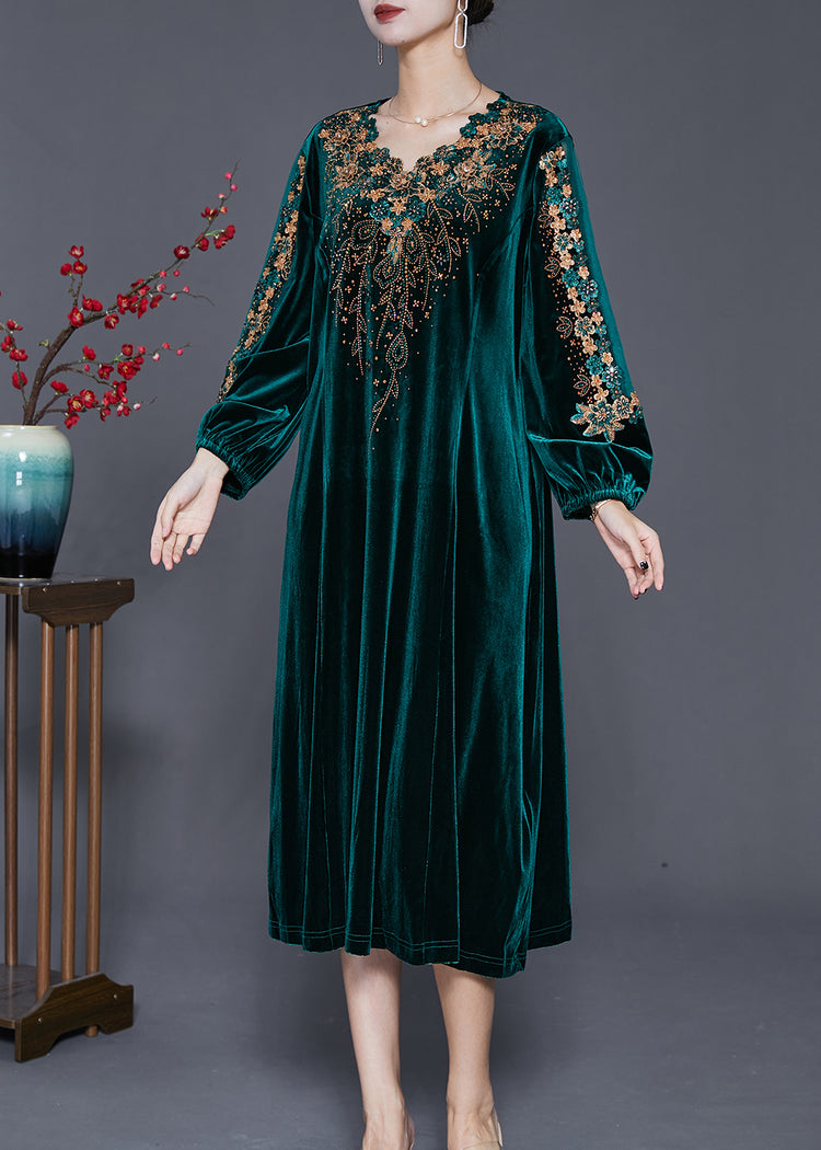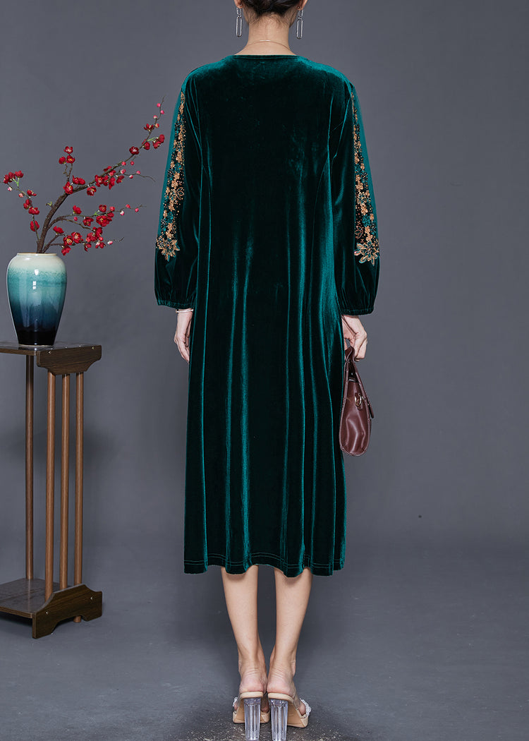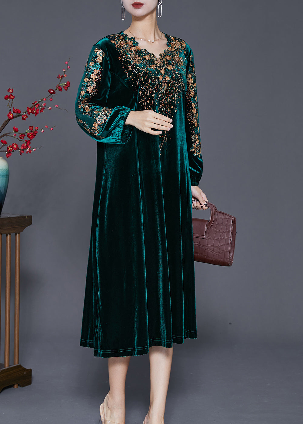 Beautiful Green Embroideried Hollow Out Silk Velour Dress Fall