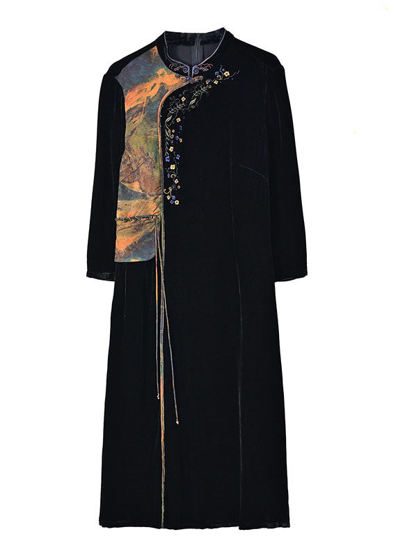 Bohemian Black Print Embroideried Tassel Silk Velour Maxi Dresses Fall
