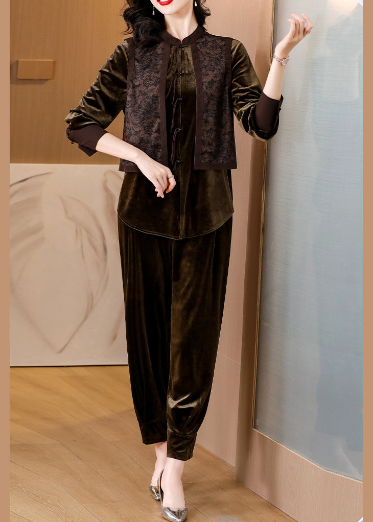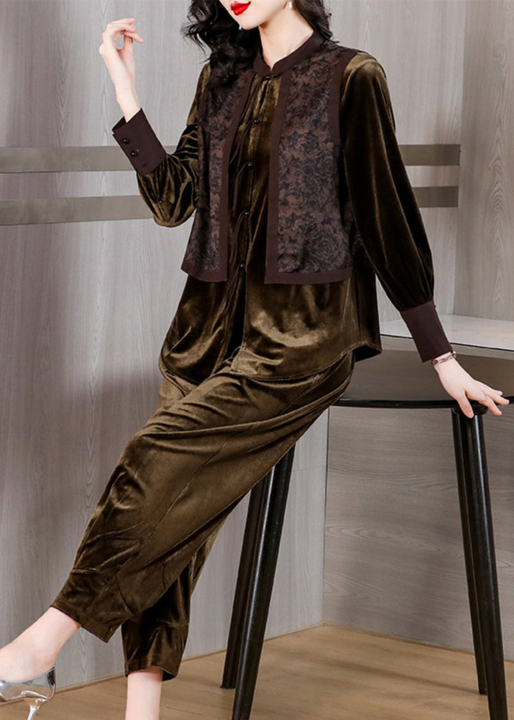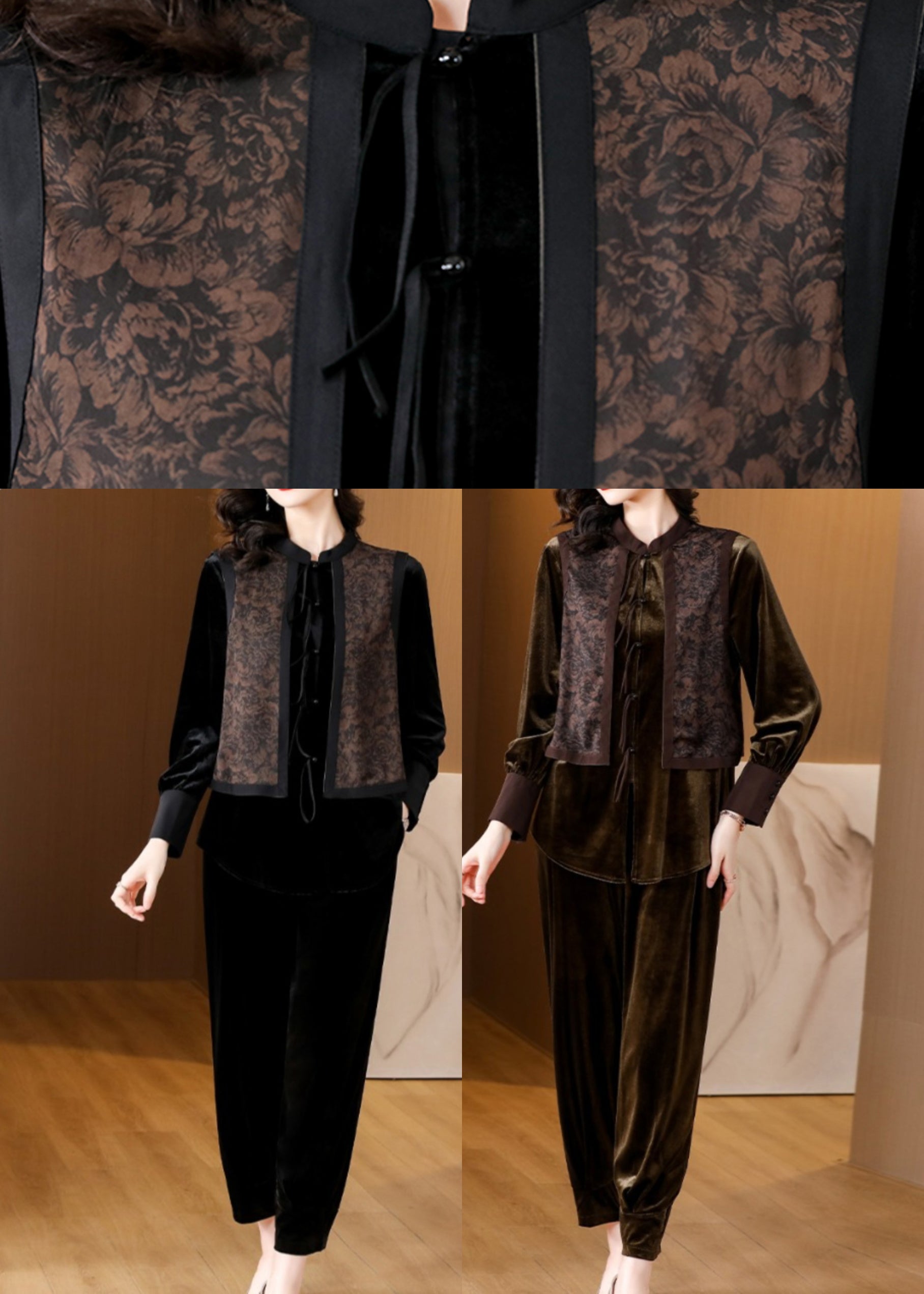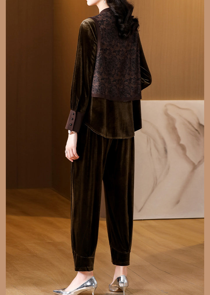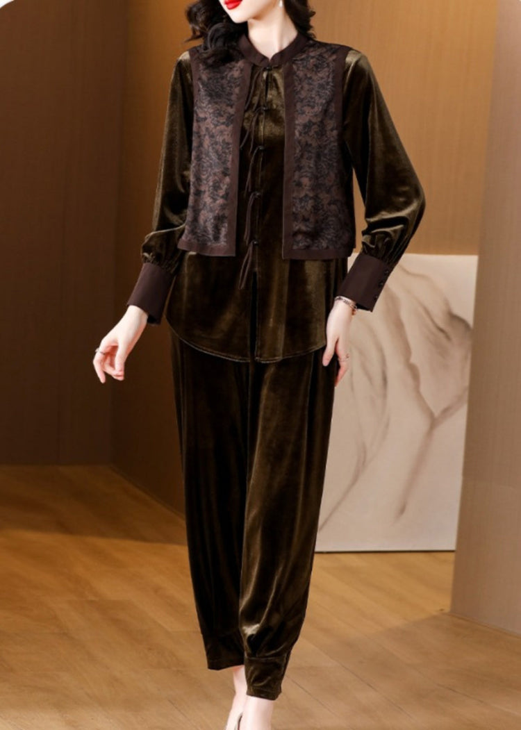 Bohemian Brown Patchwork Button Silk Velour Top And Harem Pants Two Pieces Set Long Sleeve
