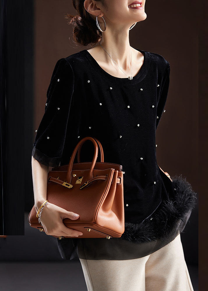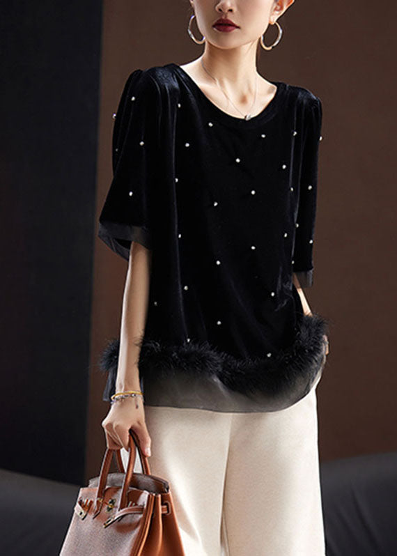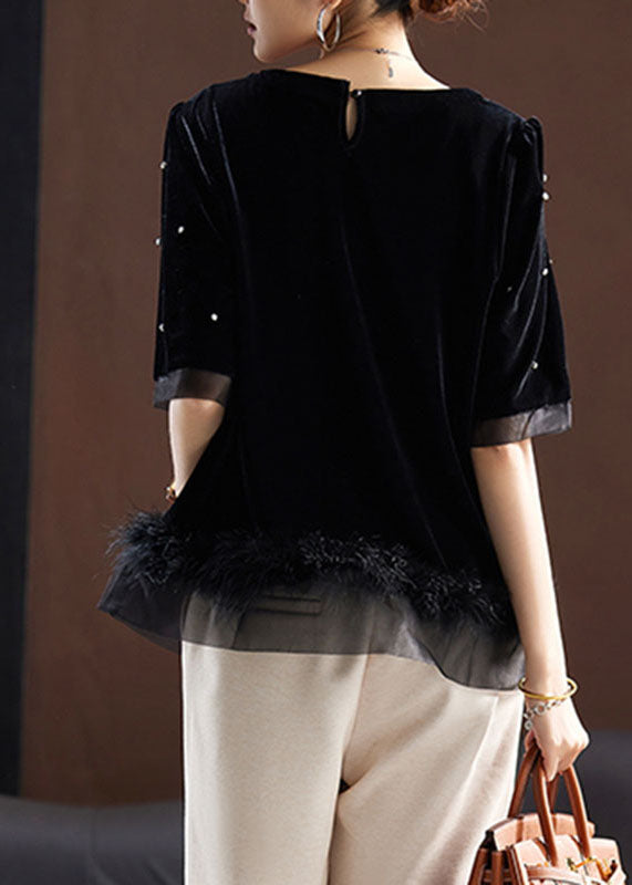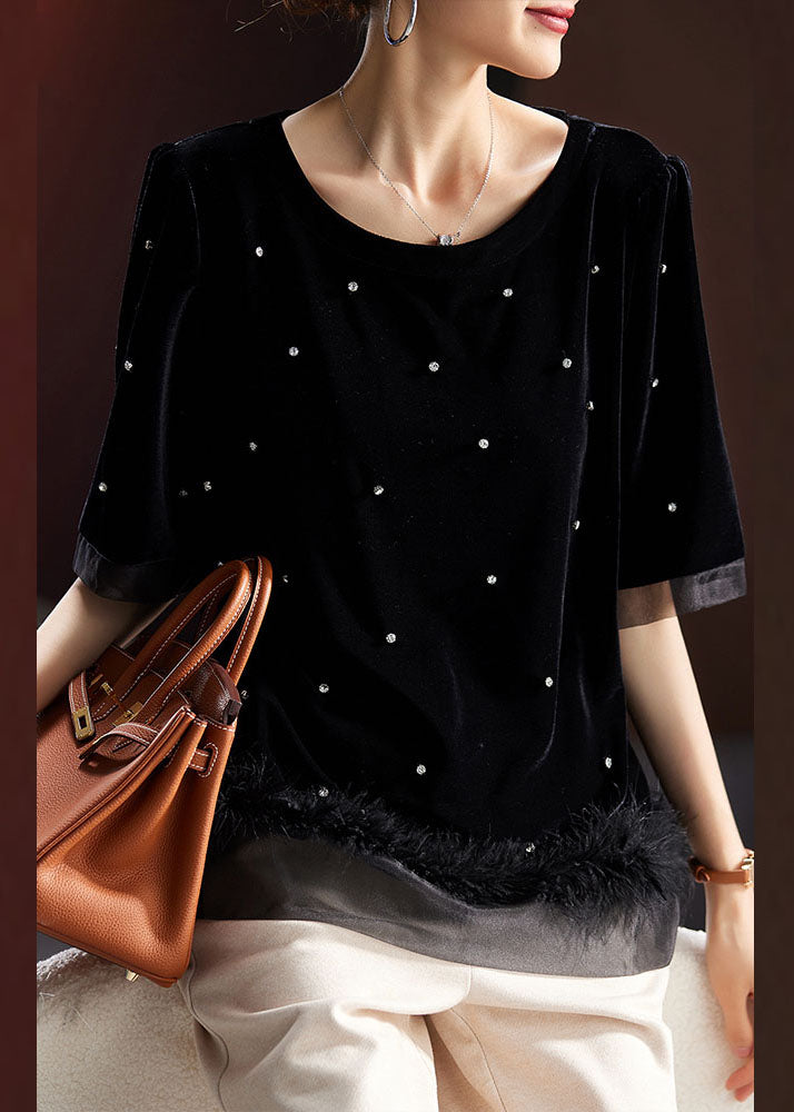 Boho Black O-Neck Zircon Tassel Patchwork Fluffy Silk Velour Top Summer