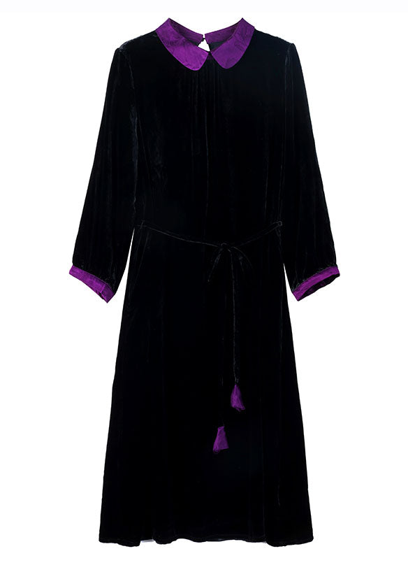 Boho Black Peter Pan Collar Patchwork Silk Velour Maxi Dresses Long Sleeve